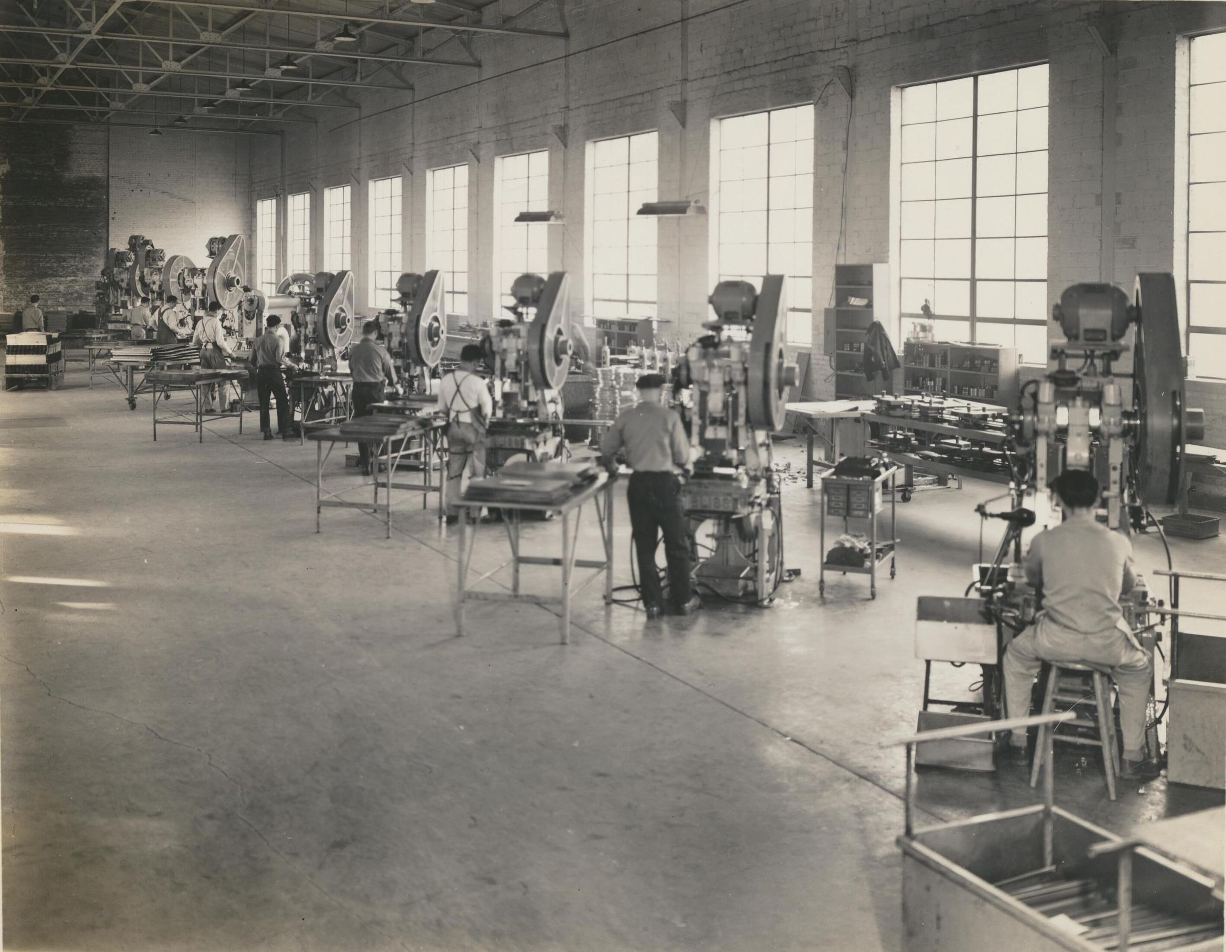 Photograph. Workers at old Olympia brewery site, which by this time had become Jensvold Manufacturing Company, segued into Western Metalcraft, then General Metalcraft. Workers are making metal cabinets.Name/Title