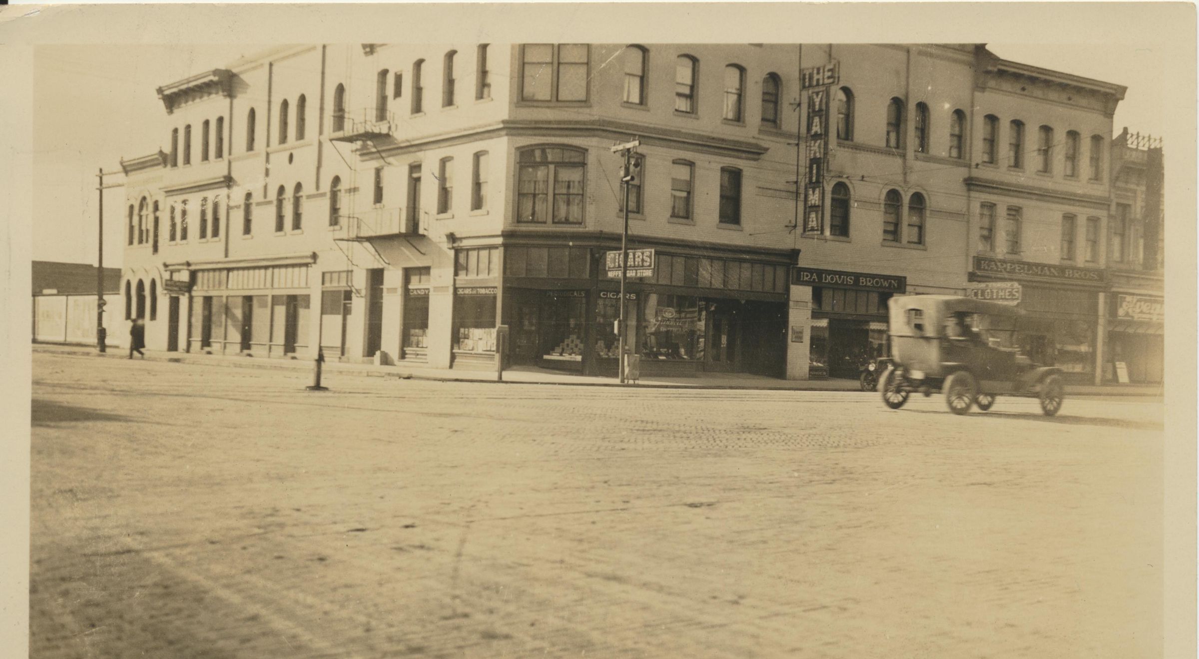 Photograph. View of Yakima Hotel, Yakima WA. Corner of East Yakima Avenue and South 3rd Street. Hotel was built in 1889 and torn down in the 1990s.