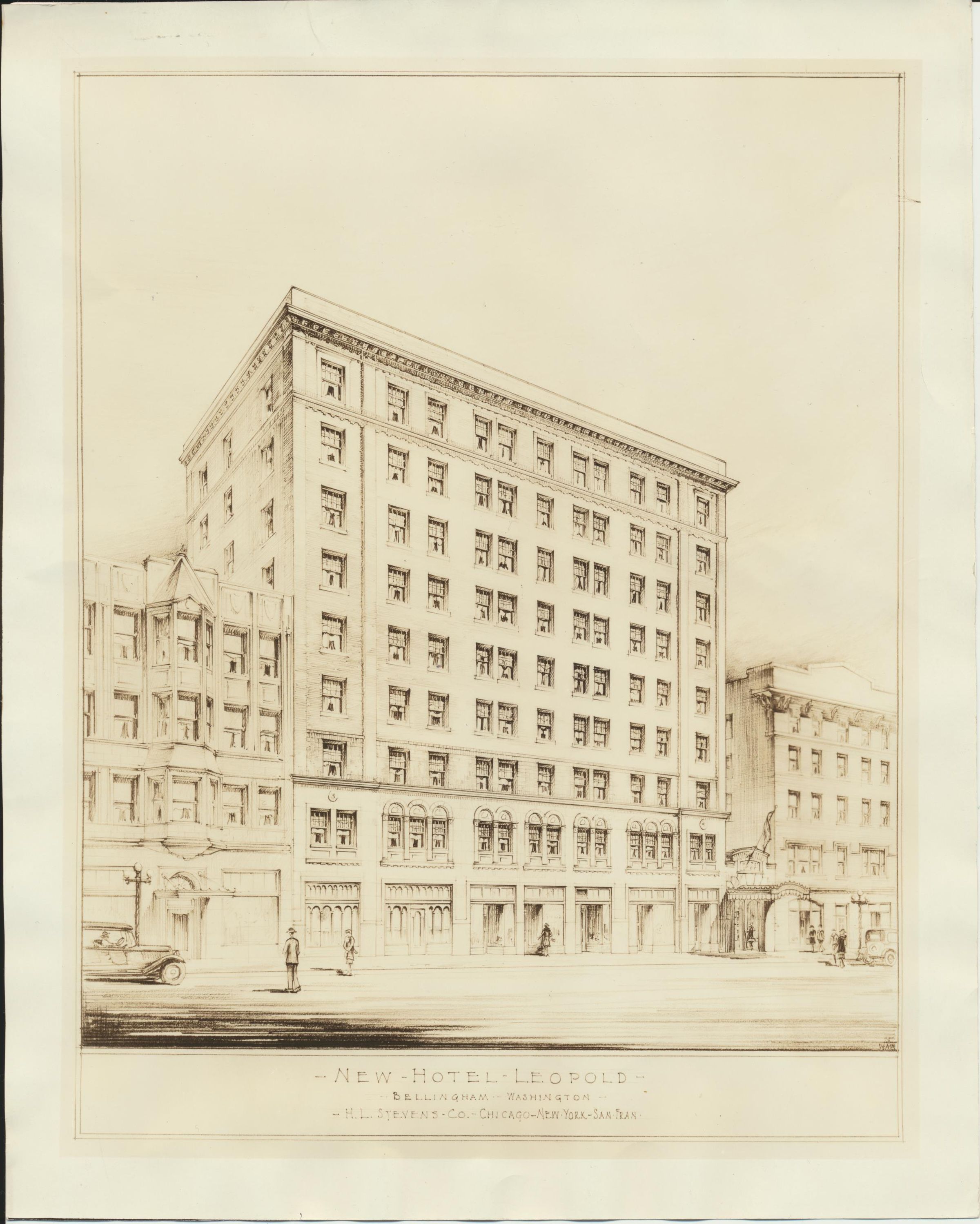 Photograph. Architect's view of New Hotel Leopold, Bellingham WA. Original hotel was built in 1899, by Josiah Byron, and was known as the Byron House Hotel. In 1910, Leopold Schmidt bought the hotel. In 1929 architect H. L. Stevens designed a large addition to the hotel.Name/Title