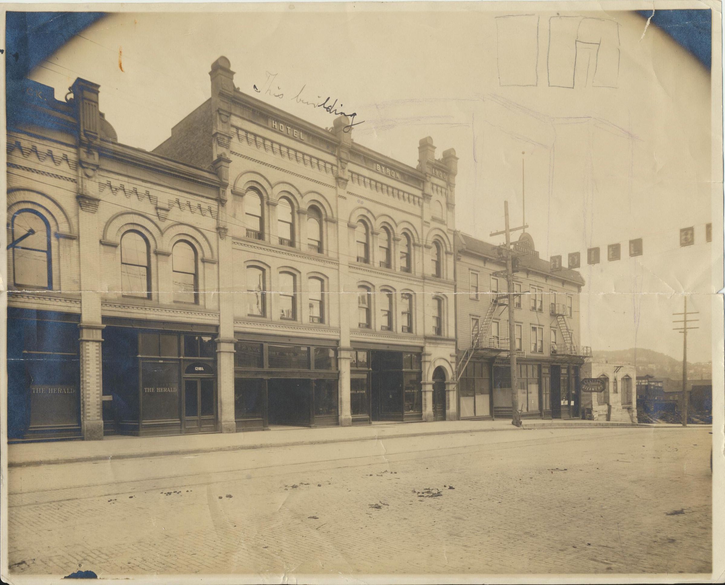 Photograph. Hotel Byron , Bellingham WA. Original hotel was built in 1899, by Josiah Byron, and was known as the Byron House Hotel. In 1910, Leopold Schmidt bought the hotel, and manager Henry Schupp renamed it the Hotel Leopold.Name/Title