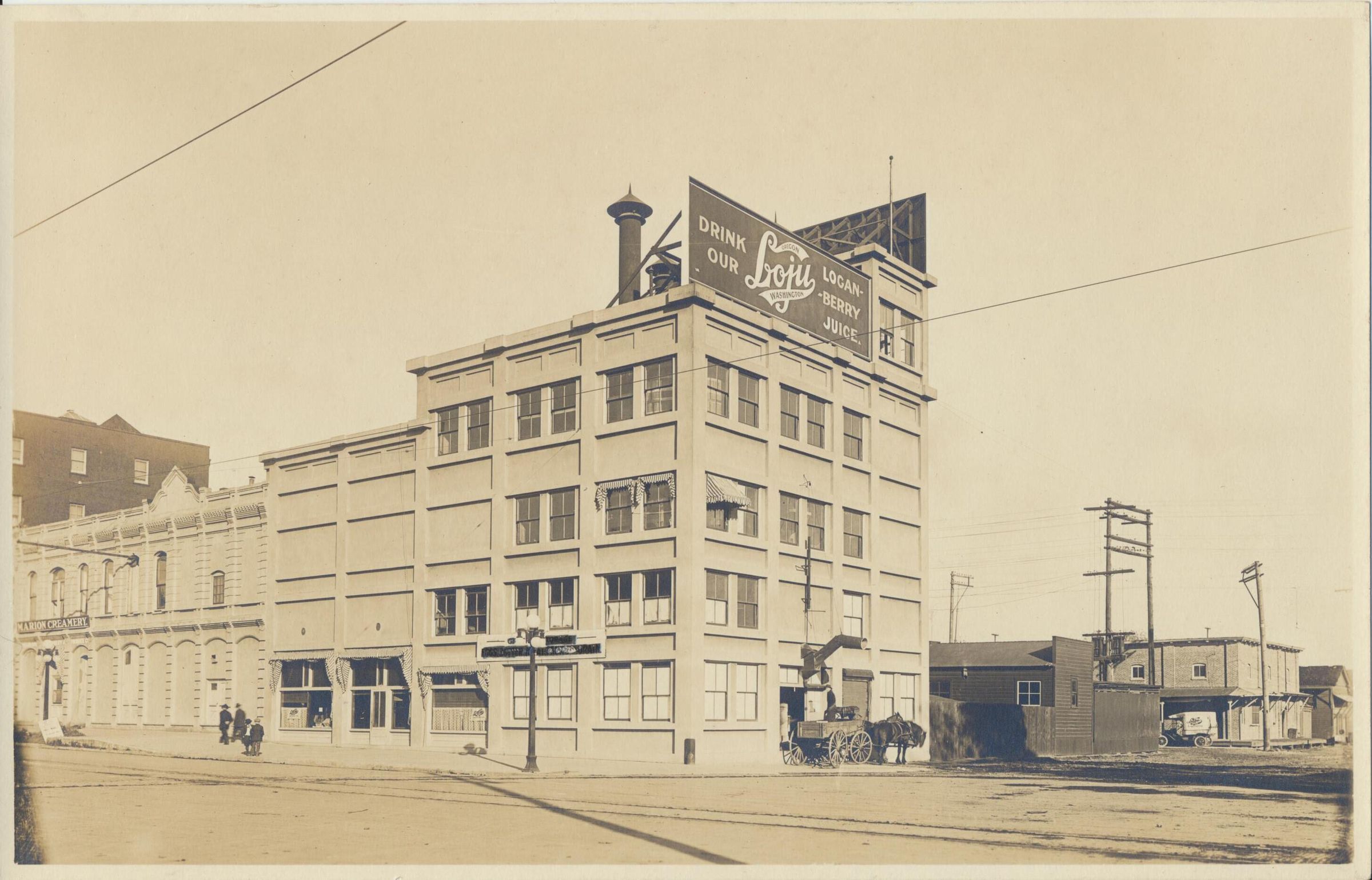 Photograph. Northwest Fruit Products Company plant in Salem OR. Formerly Salem Brewing Association brewery. This photo was taken before construction of fruit processing annex (which was built to right of existing brewery building). Just before Prohibition (end of 1915), brewery was converted to making juice from loganberries. Principal product was Loju.Name/Title