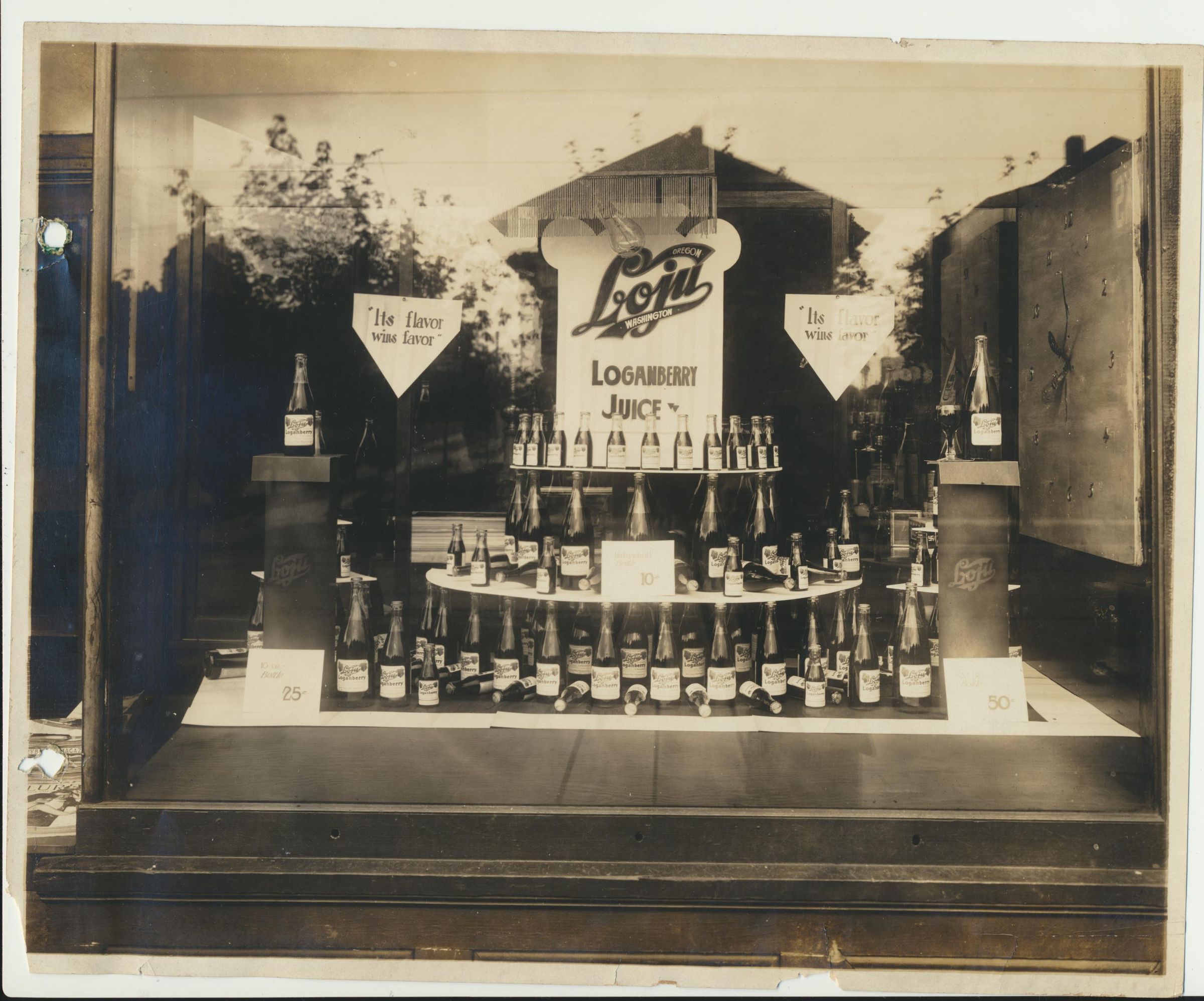 Photograph. Store window display (unknown location) of Loju beverage, made at Northwest Fruit Products Company plant in Salem OR. Formerly Salem Brewing Association brewery. Just before Prohibition (end of 1915), brewery was converted to making juice from loganberries. Principal product was Loju.Name/Title