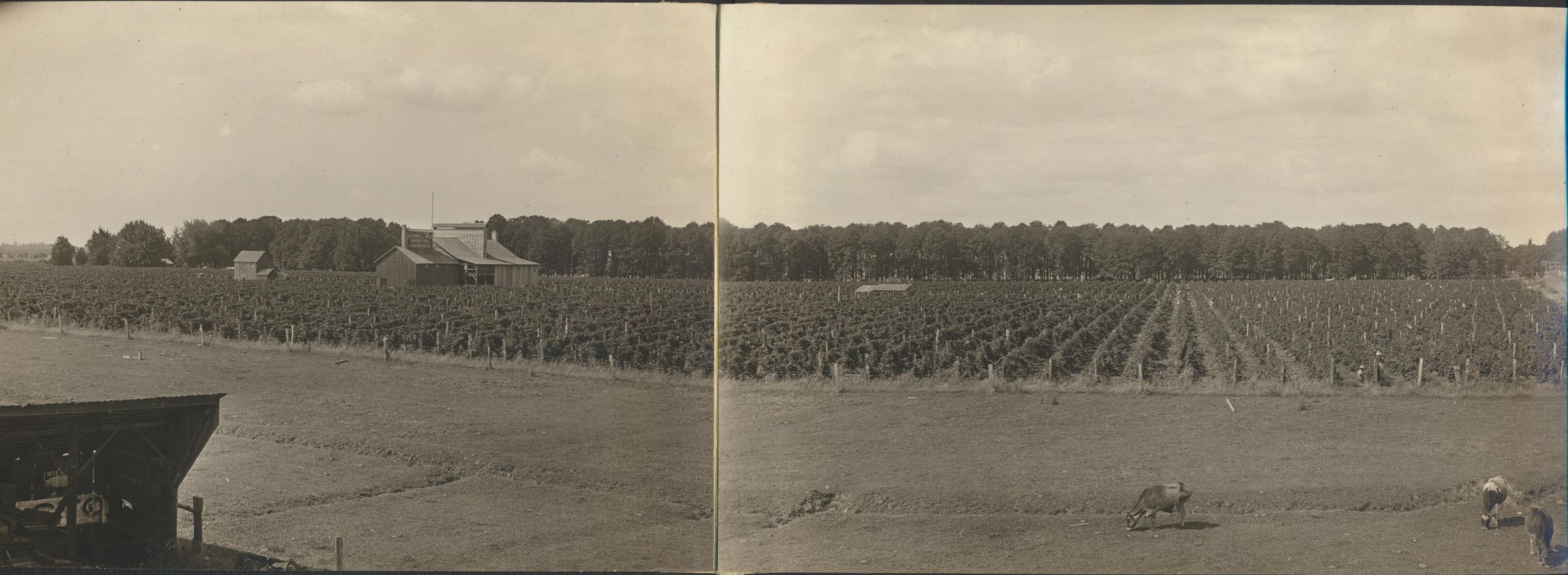 Photograph. Fields of loganberries, grown for Northwest Fruit Products Company plant in Salem OR. Formerly Salem Brewing Association brewery. Just before Prohibition (end of 1915), brewery was converted to making juice from loganberries. Principal product was Loju.Name/Title