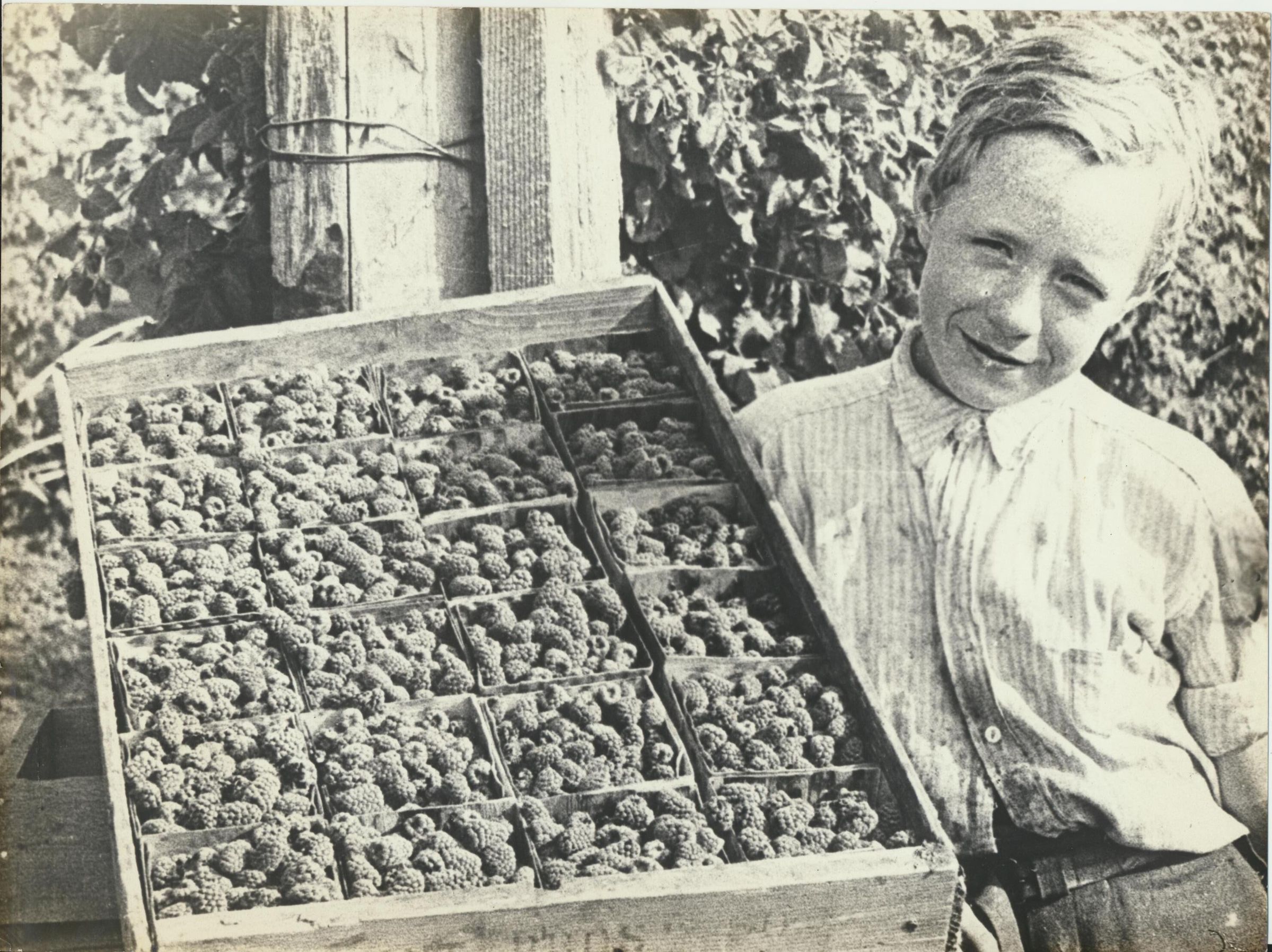 Photograph. Loganberries, grown for Northwest Fruit Products Company plant in Salem OR. Formerly Salem Brewing Association brewery. Just before Prohibition (end of 1915), brewery was converted to making juice from loganberries. Principal product was Loju.Name/Title