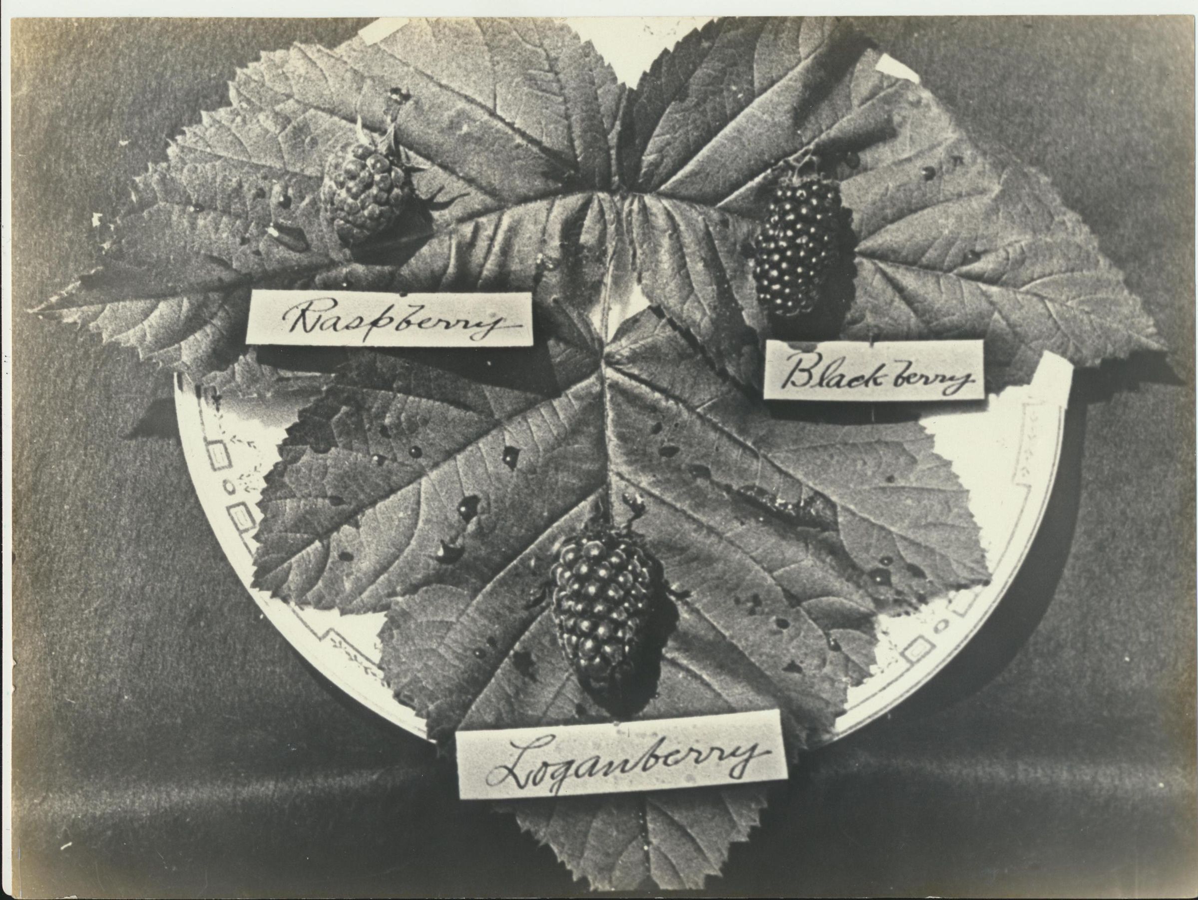 Photograph. Comparison of raspberries, blackberries and loganberries. Loganberries were grown for Northwest Fruit Products Company plant in Salem OR. Formerly Salem Brewing Association brewery. Just before Prohibition (end of 1915), brewery was converted to making juice from loganberries. Principal product was Loju.Name/Title