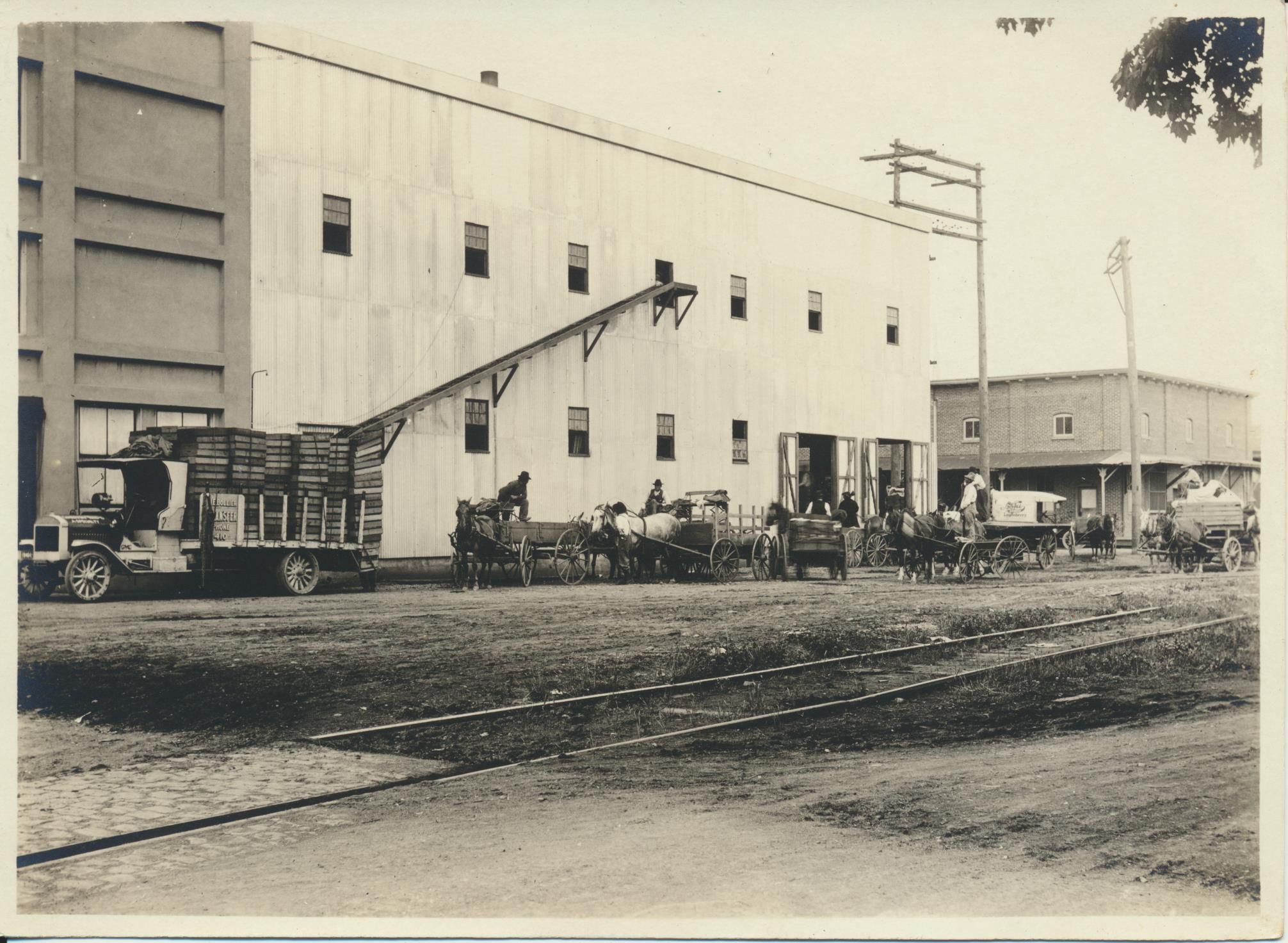 Truck and wagons are unloading crates of loganberries. Building at far left is old brewery converted to fruit juice production. Center building is fruit processing annex.Name/Title