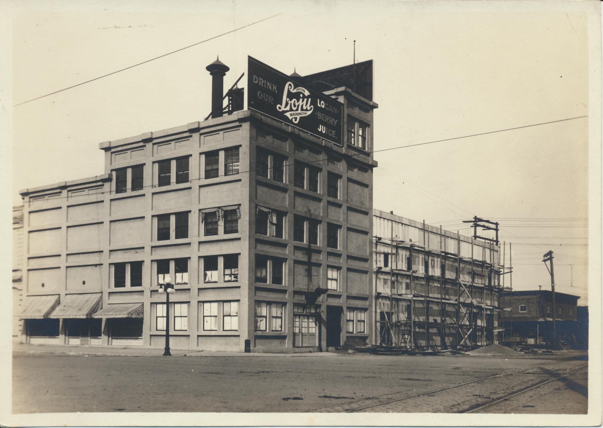 Photograph. Northwest Fruit Products Company/Canning Co. plant in Salem OR. Formerly Salem Brewing Association brewery. Just before Prohibition (end of 1915), brewery was converted to making juice from loganberries. Principal product was Loju. Building in foreground is old brewery. Building under construction is fruit processing annex. Written on back of photo: "About 1916--Salem Ore, on South Commercial St. Brewery with new fruit juice signs. Construction of fruit processing annex. Brick building is brewery bottle shop which was constructed for 6oz lager, pts & qts"Name/Title