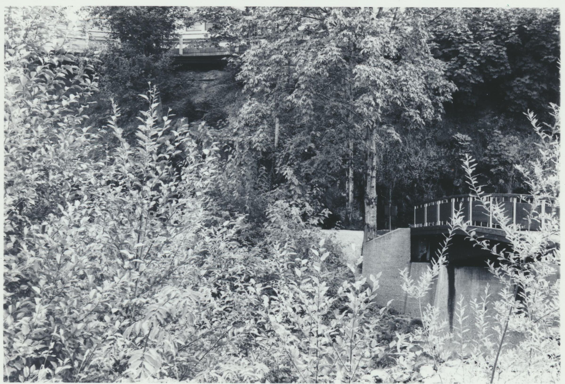 Photograph. View looking east at Tumwater Falls Park, footbridge across upper falls, Olympia brewery in background.