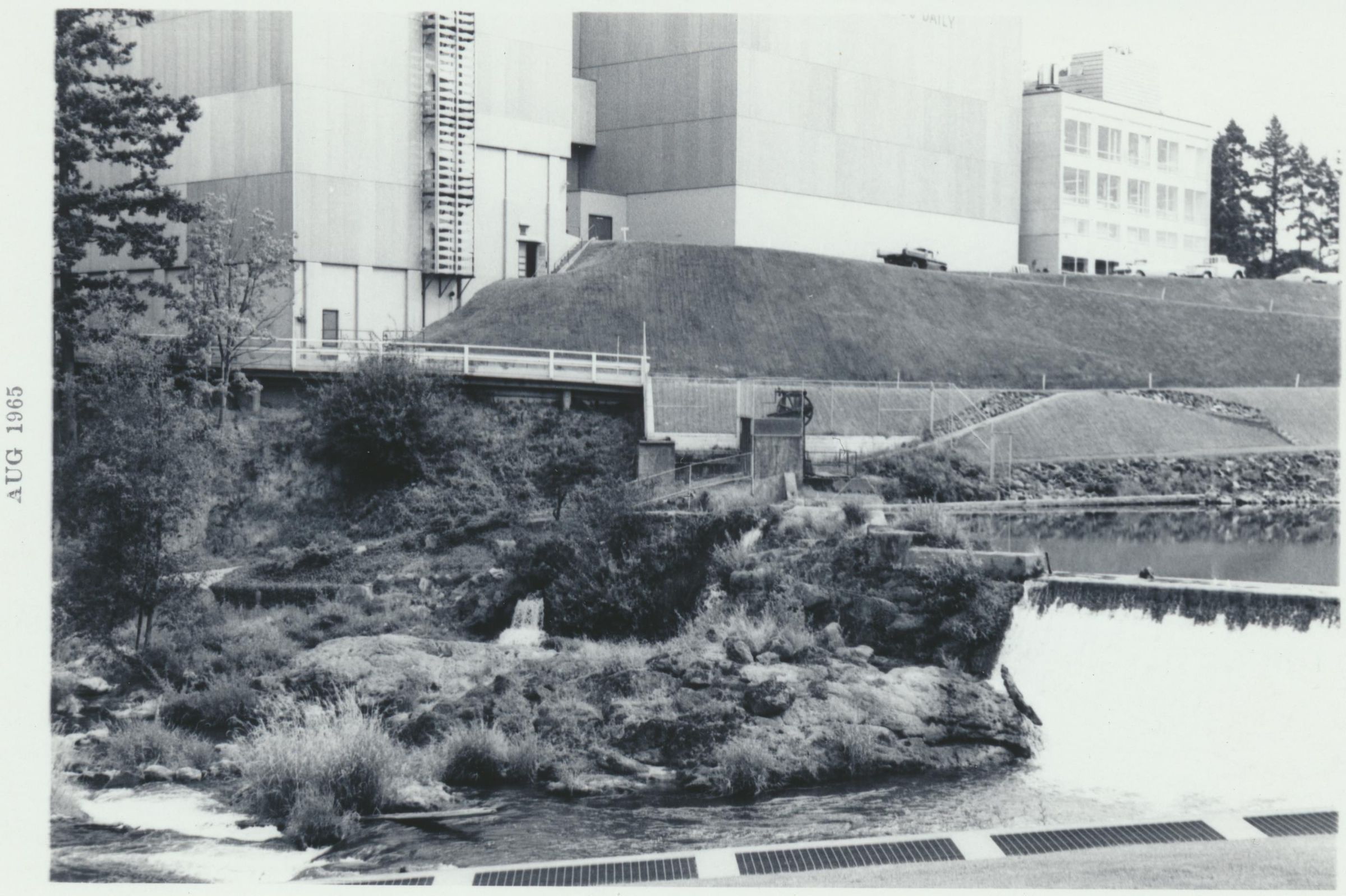 Photograph. View looking northeast at Tumwater Falls Park, fish ladder along upper falls, Olympia brewery in background.