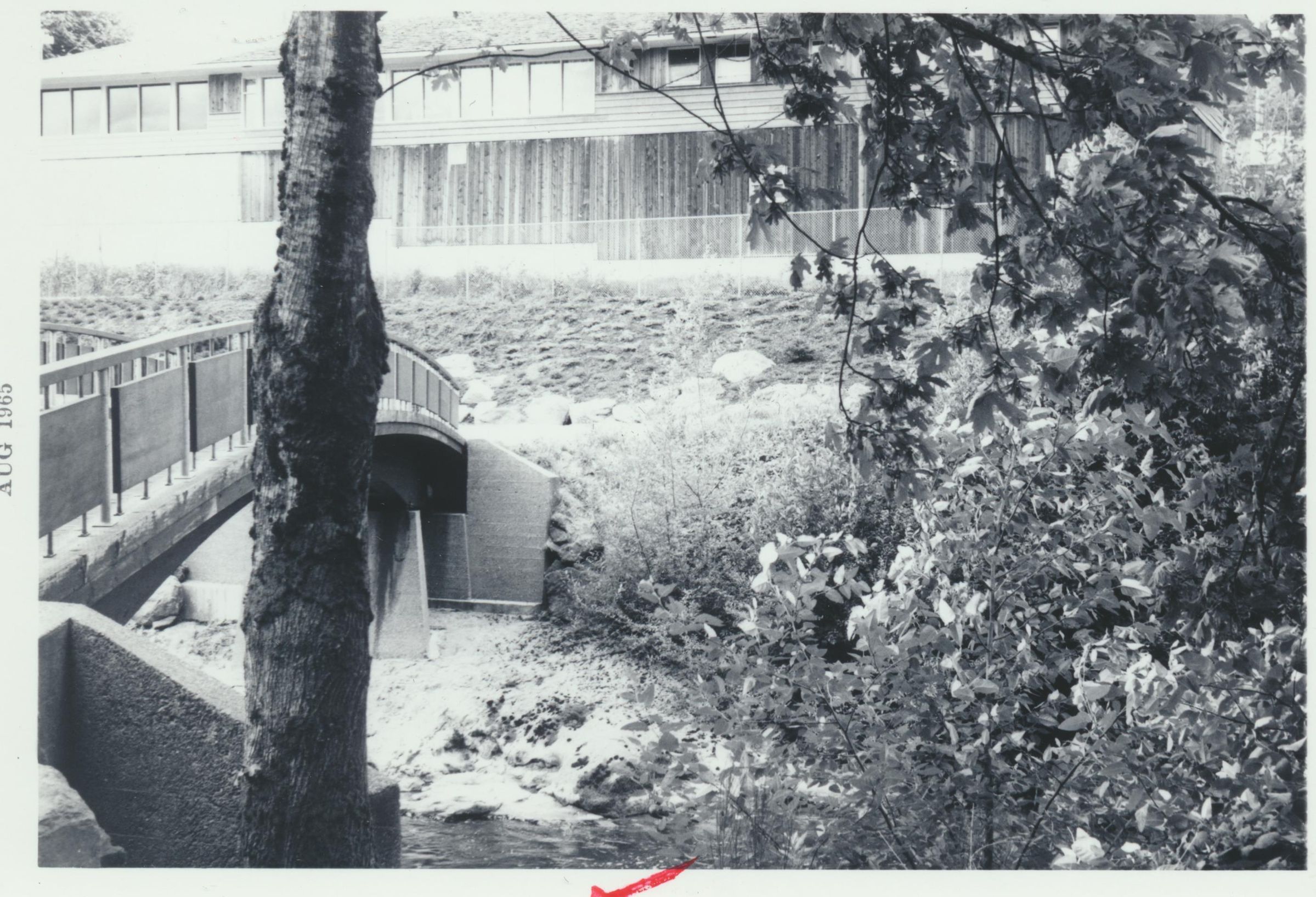 Photograph. View looking west at Tumwater Falls Park, footbridge across upper falls, restaurant in background.