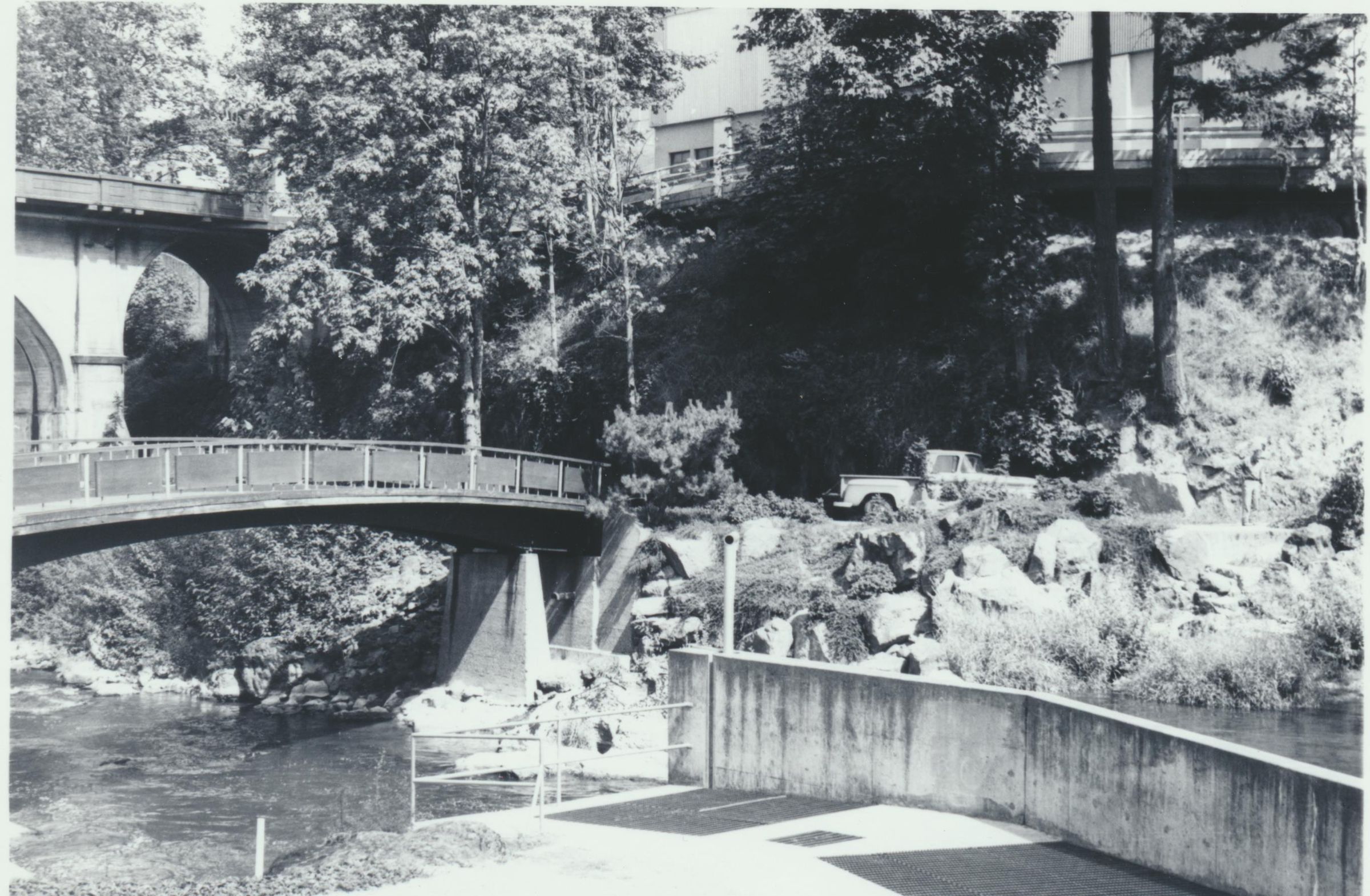Photograph. View looking northeast in Tumwater Falls Park, bridge across upper falls, Boston Street bridge at far left, fish ladder in foreground, brewery in background.