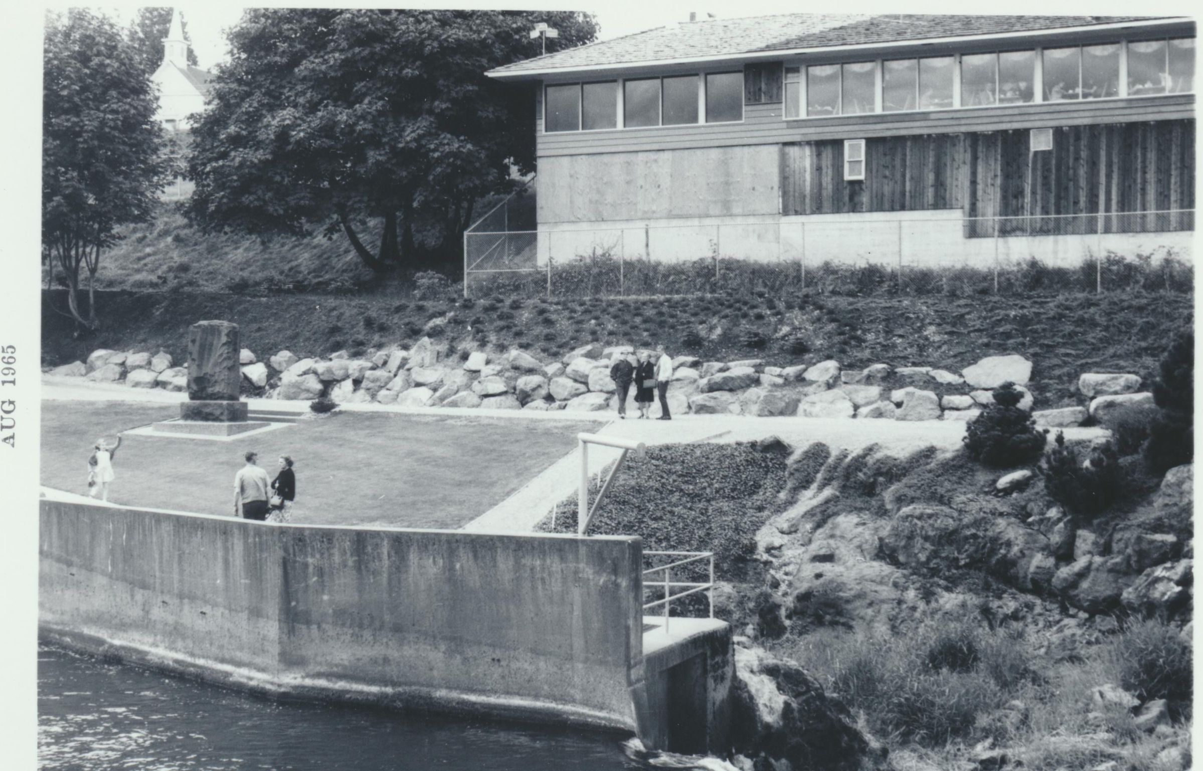 Photograph. View looking southwest in Tumwater Falls Park, near upper falls, fish ladder, Oregon Trail marker, restaurant in background.