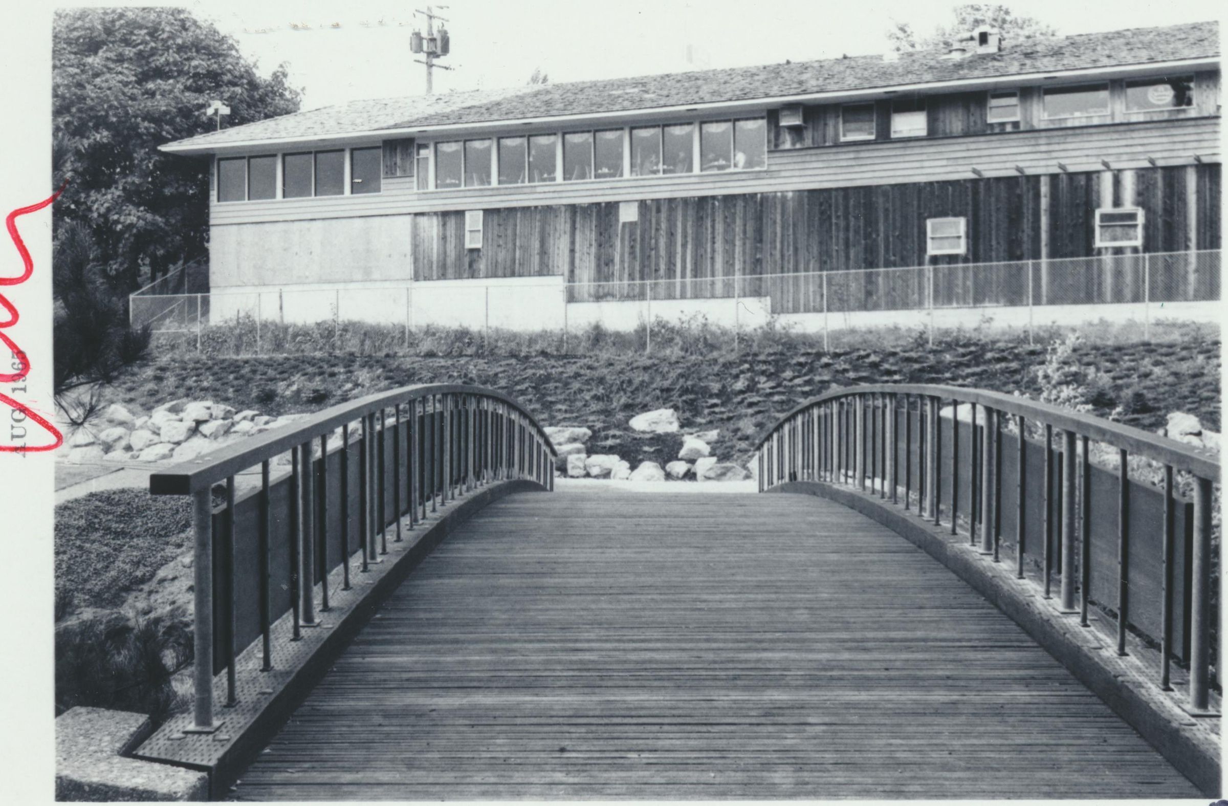 Photograph. View looking southwest in Tumwater Falls Park, near upper falls, footbridge over upper falls, restaurant in background.