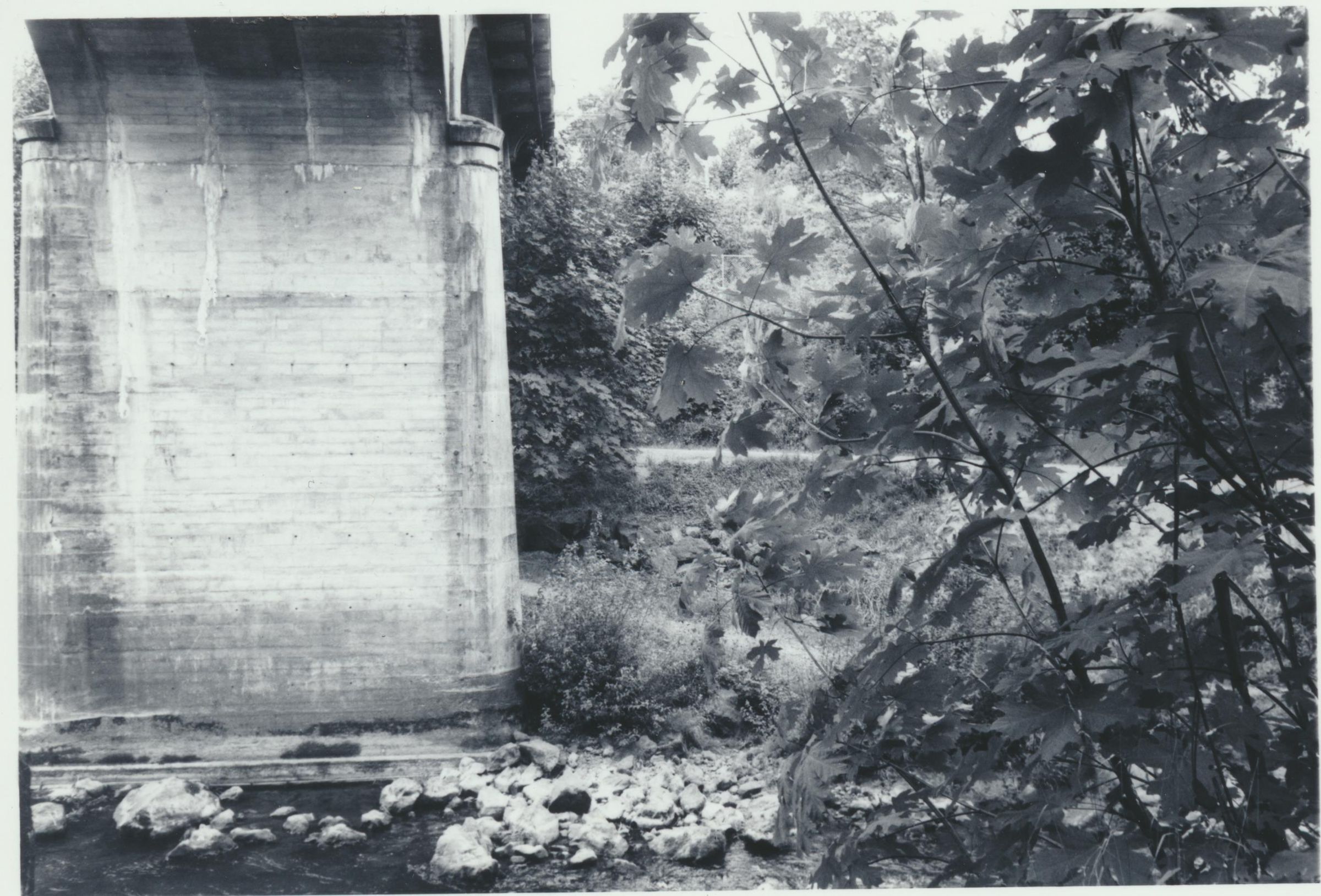 Photograph. View looking west in Tumwater Falls Park, showing Boston Street Bridge abutment.