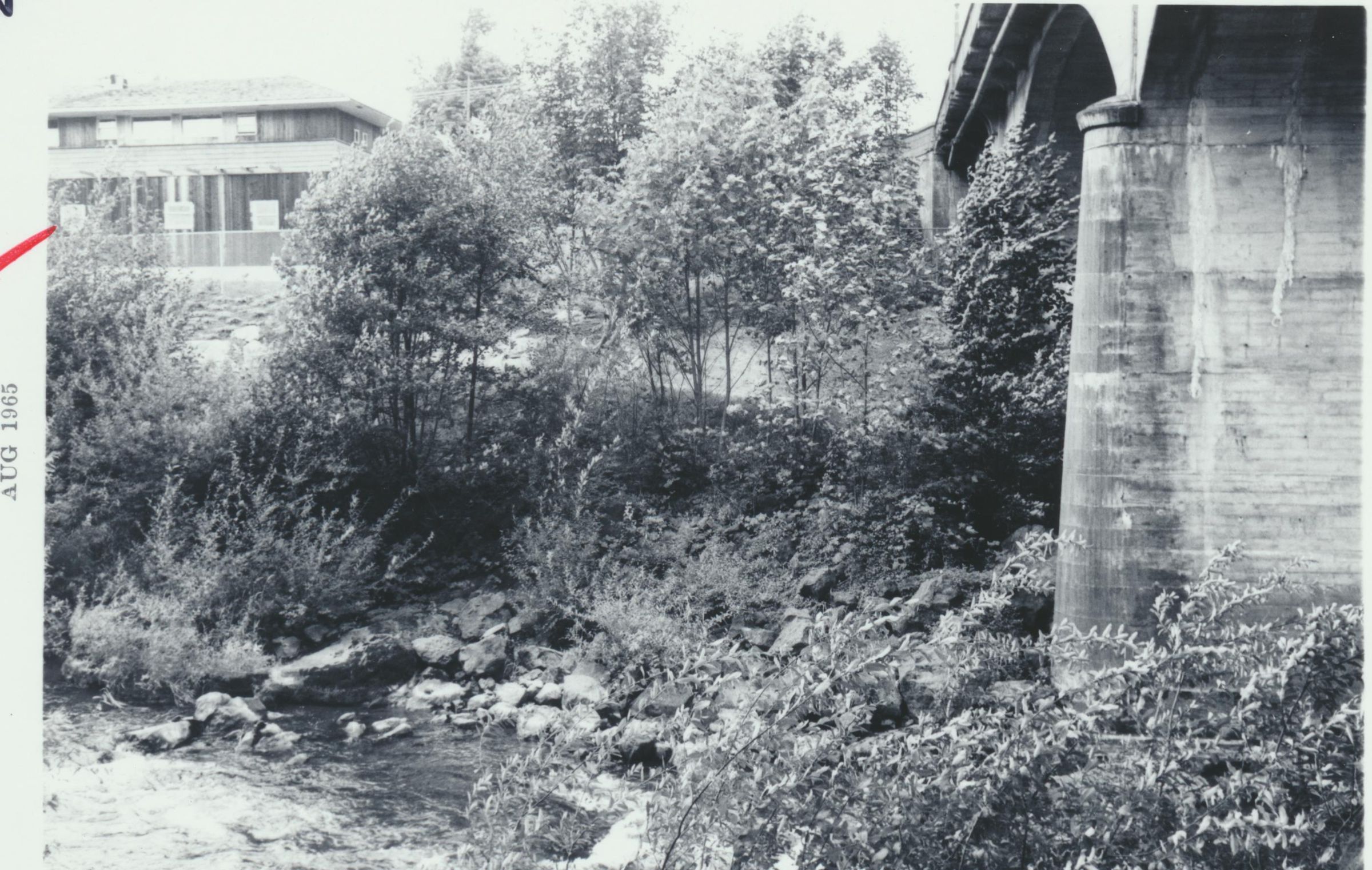 Photograph. View looking west in Tumwater Falls Park, showing Boston Street Bridge abutment, restaurant in background.