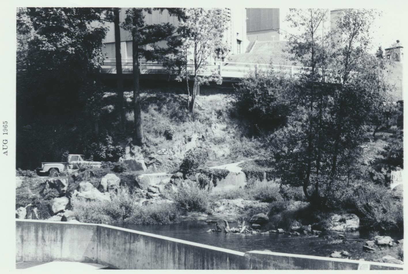 Photograph. View looking northeast in Tumwater Falls Park, showing retaining wall/walkway in foreground, brewery buildings in background.