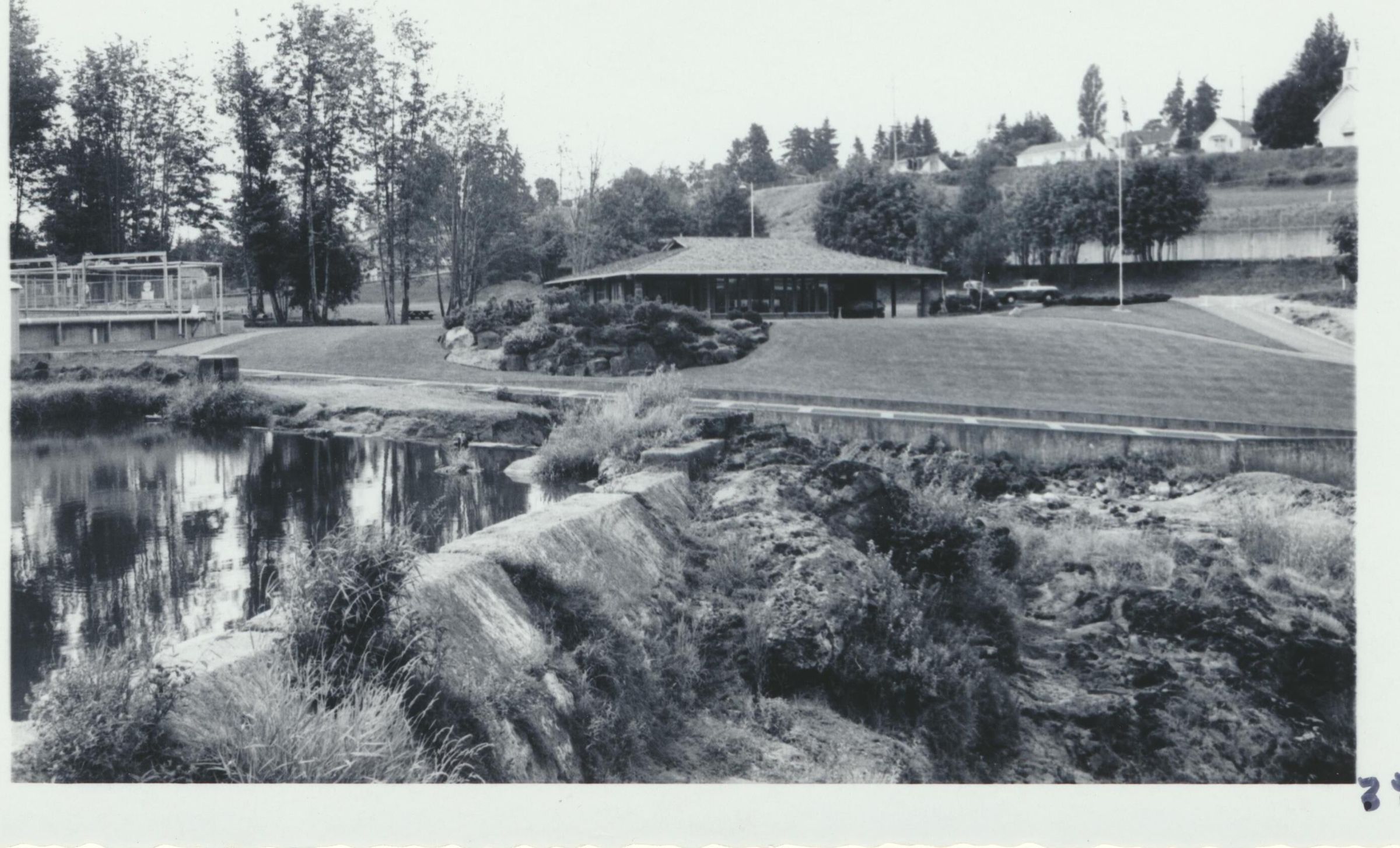 Photograph. View looking southwest in Tumwater Falls Park. Park office building in background, salmon recovery facility on left, dam in foreground.