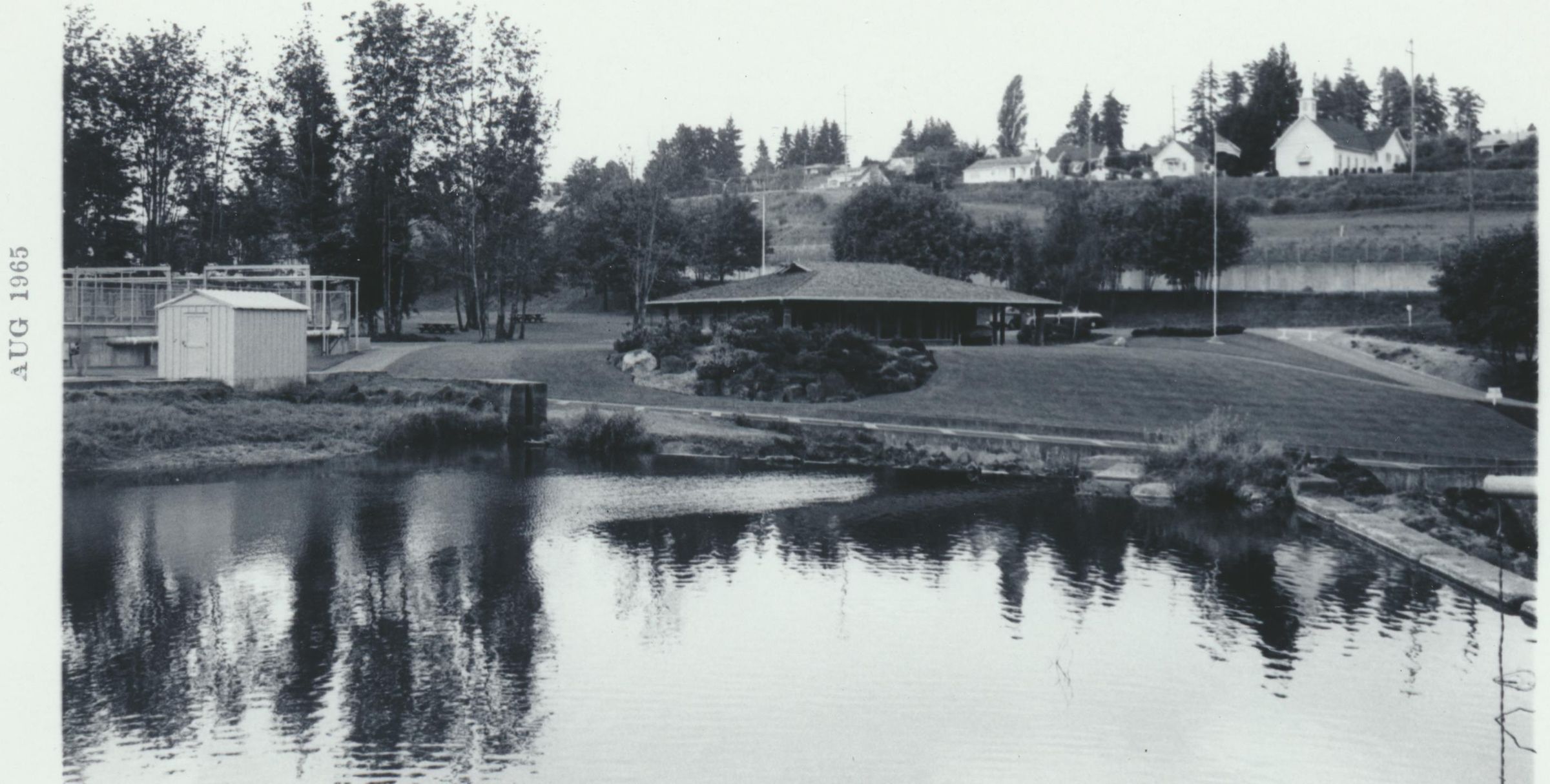 Photograph. View looking southwest in Tumwater Falls Park. Park office building in background, salmon recovery facility on left.