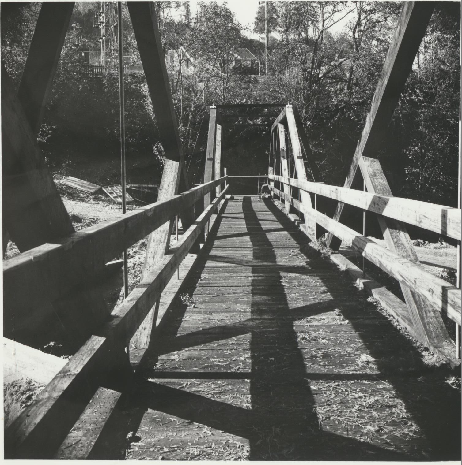 Photograph. Footbridge over lower falls in Tumwater Falls Park. Looking west.