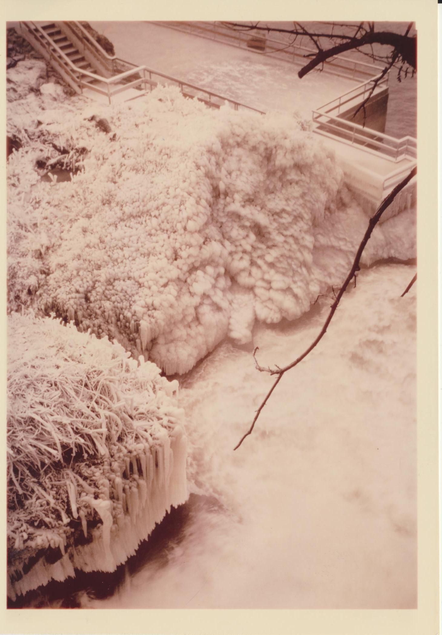 Photograph. Viewing platform below lower falls in Tumwater Falls Park. Looking northwest. Winter, with snow and ice.