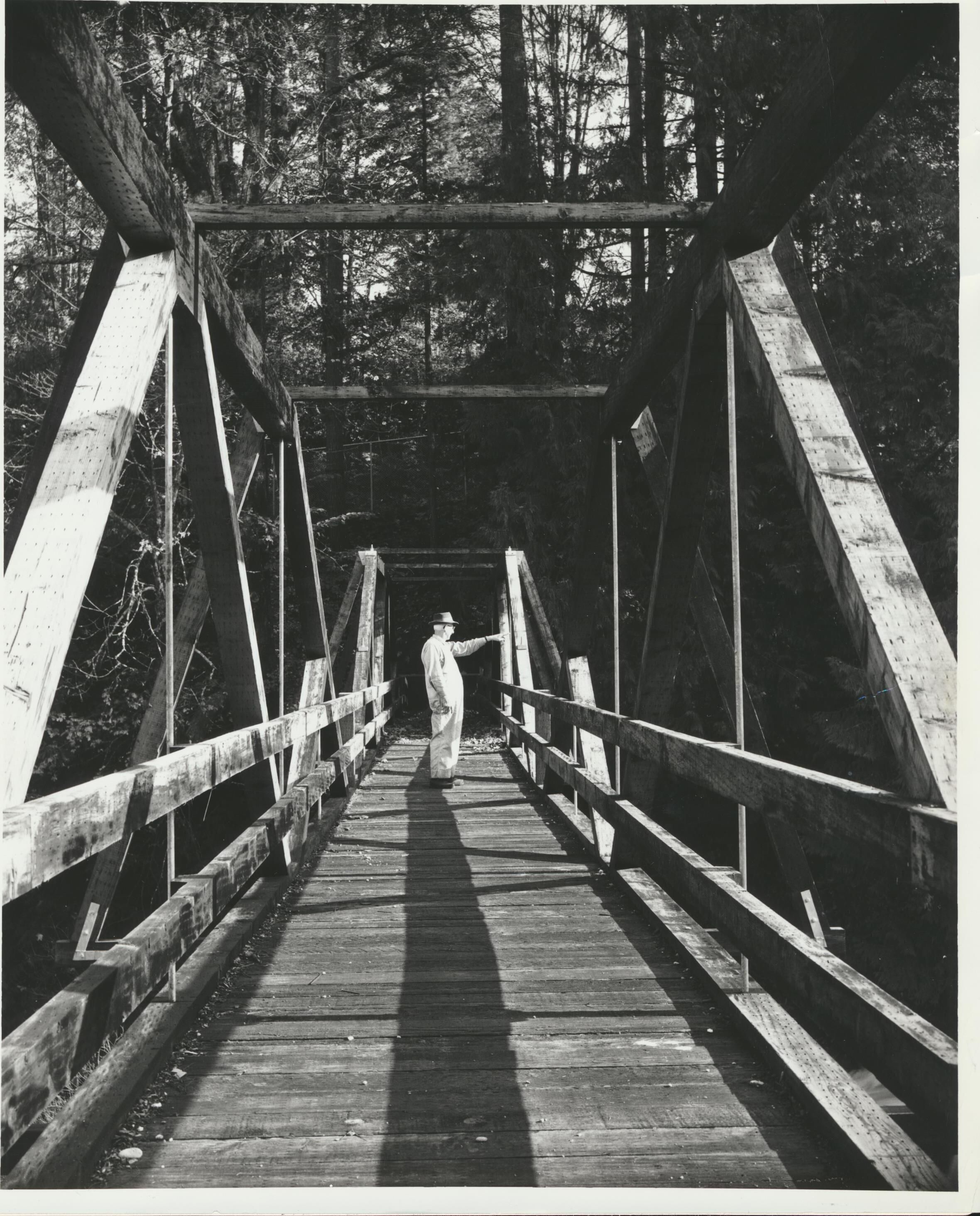 Photograph. Footbridge over lower falls in Tumwater Falls Park. Looking east. Man is Al Schwarze, retired Olympia brewery employee. Original footbridge over lower falls was built in 1890s. In 1962, it was restored--restoration shown here.Name/Title