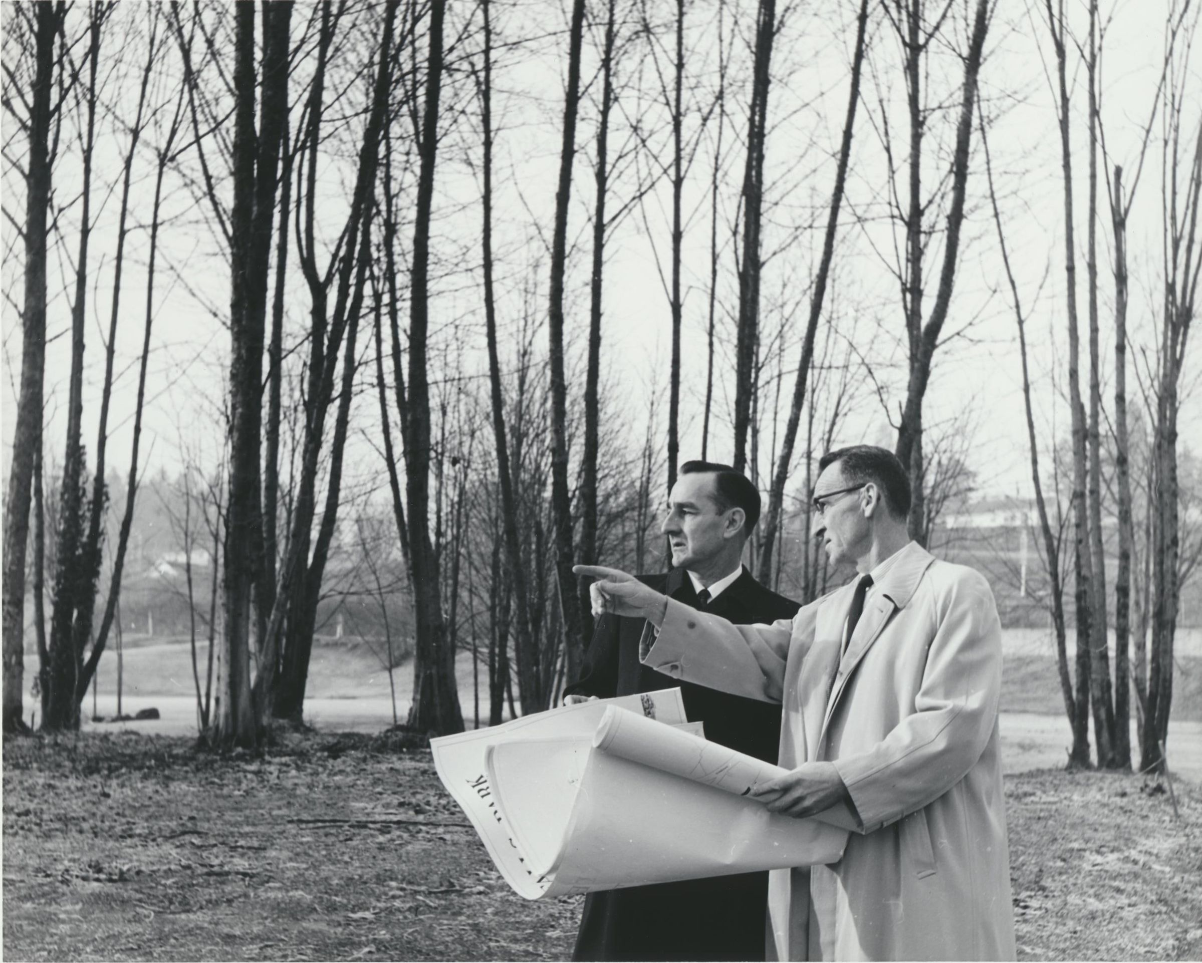 Photograph. Bink Schmidt and Bump Schmidt discussing plans for Tumwater Falls Park.