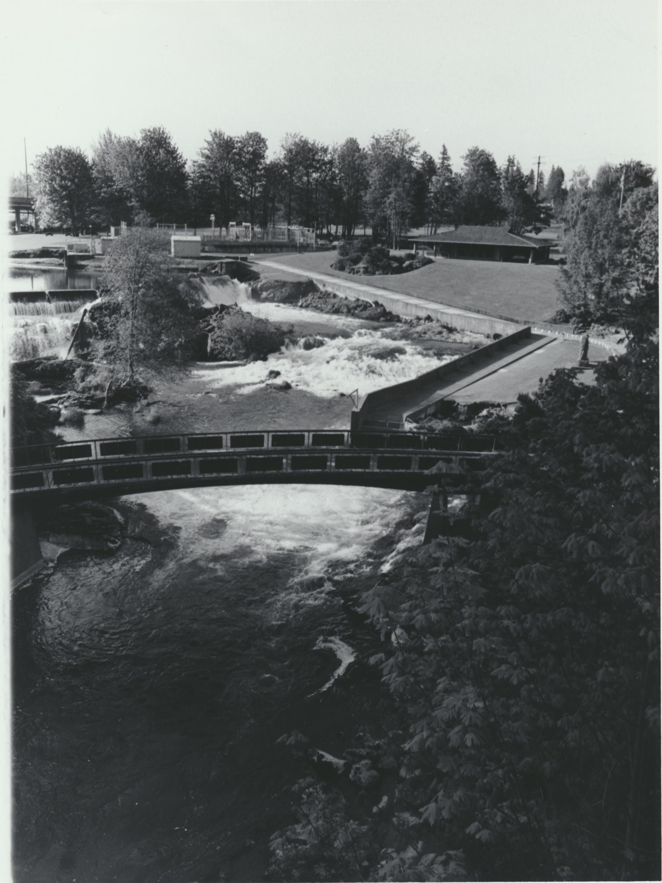 Photograph. View of Tumwater Falls Park looking southeast. Footbridge across river, fish ladder, and park office in background.