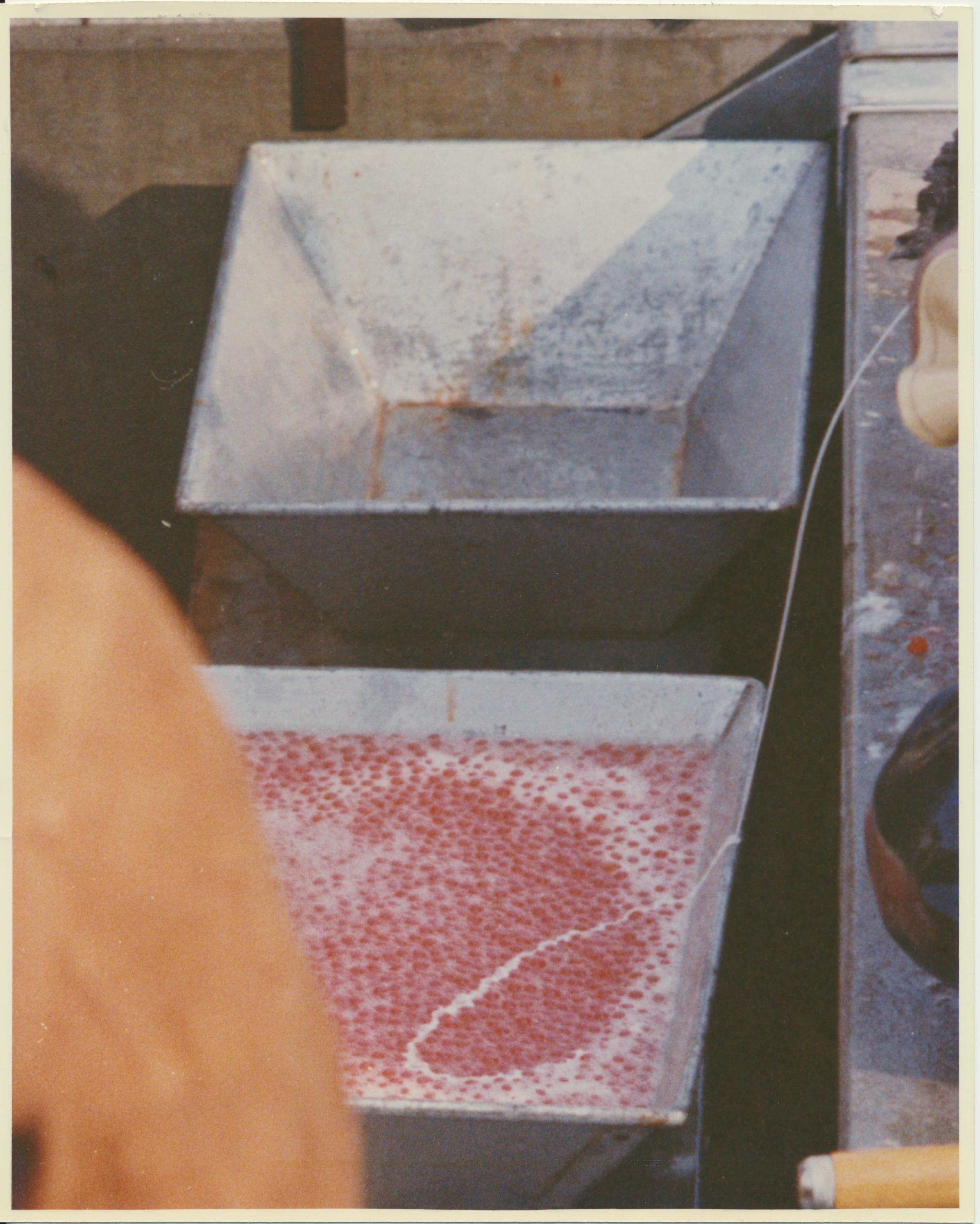Photograph. State of WA Dept. of Fisheries salmon holding facility at Tumwater Falls Park. Salmon eggs and milt are extracted and mixed.