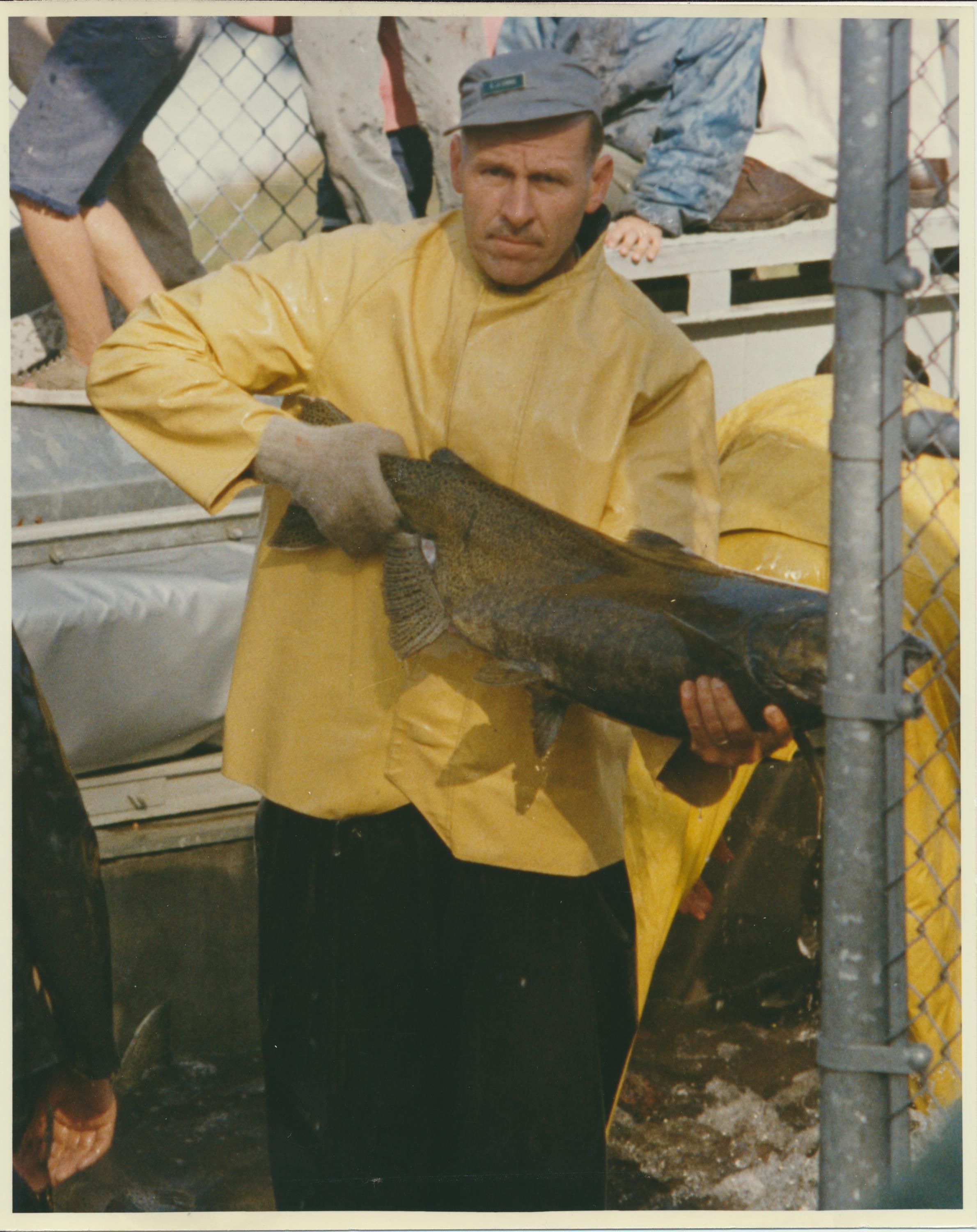Photograph. State of WA Dept. of Fisheries salmon holding facility at Tumwater Falls Park. Fisheries staff holds up salmon.