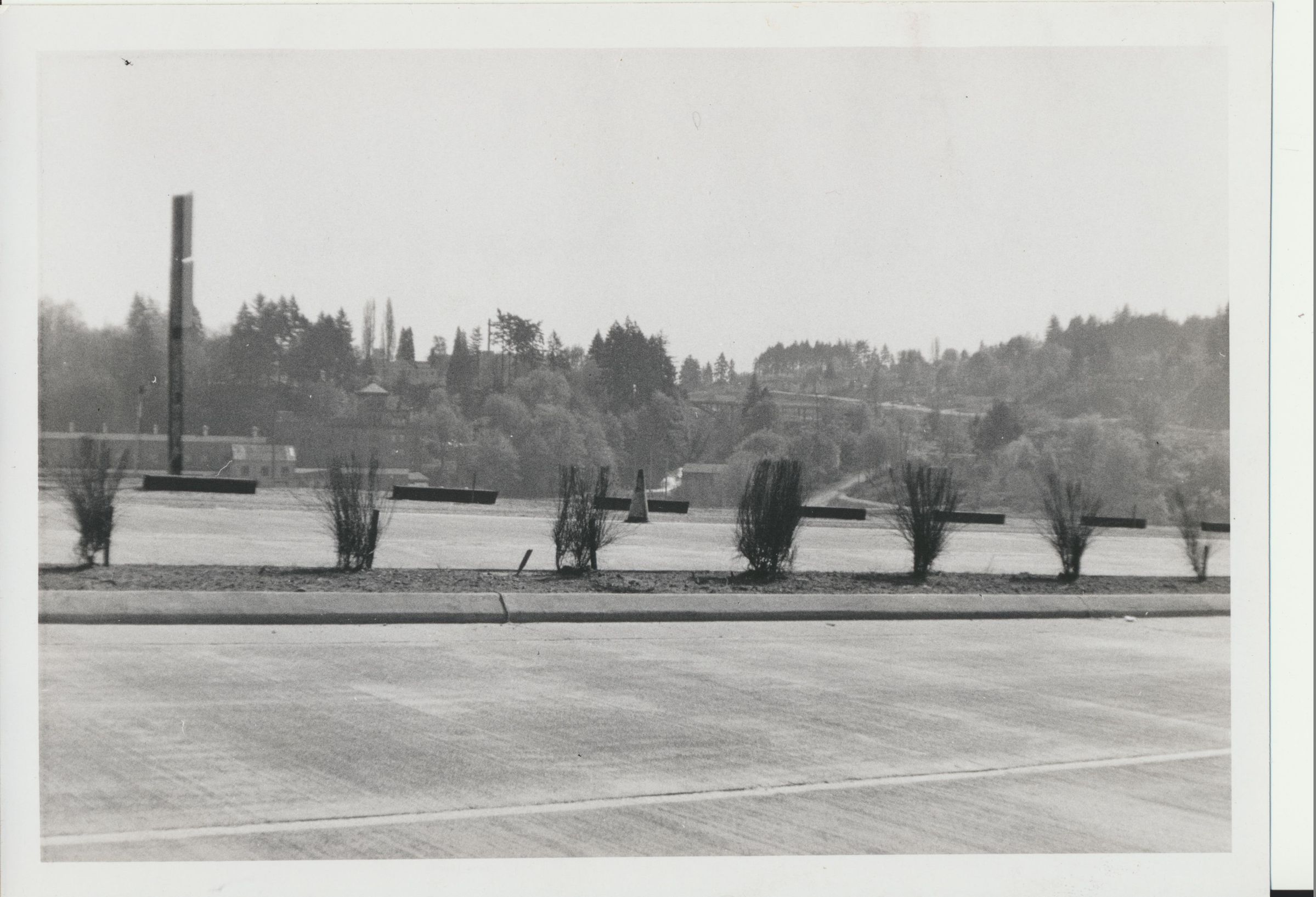 Photograph. View of I-5 looking south; old brewery and falls in background.