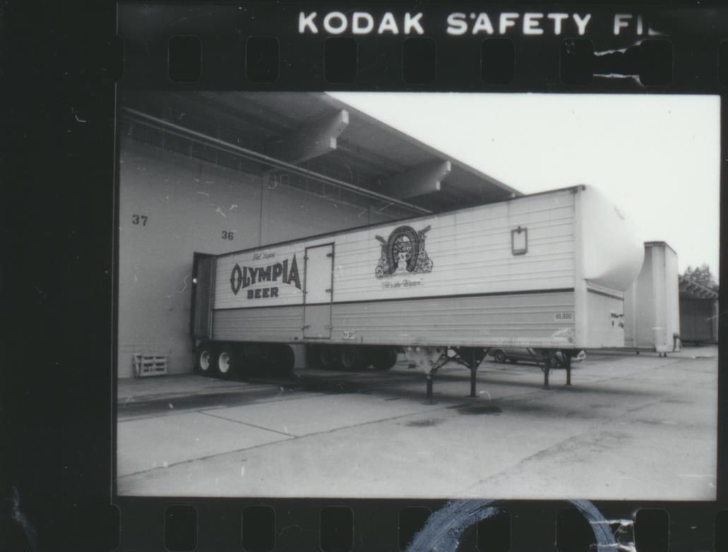 Photograph. Semi trailer at brewery loading dock. Olympia logo on side of trailer.