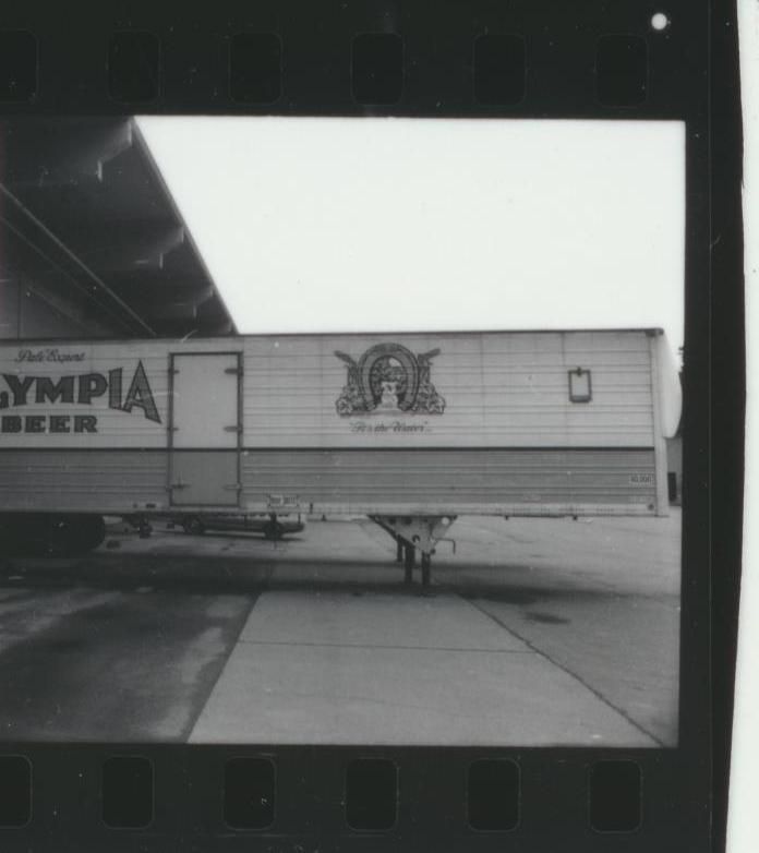 Photograph. Semi trailer at brewery loading dock. Olympia logo on side of trailer.