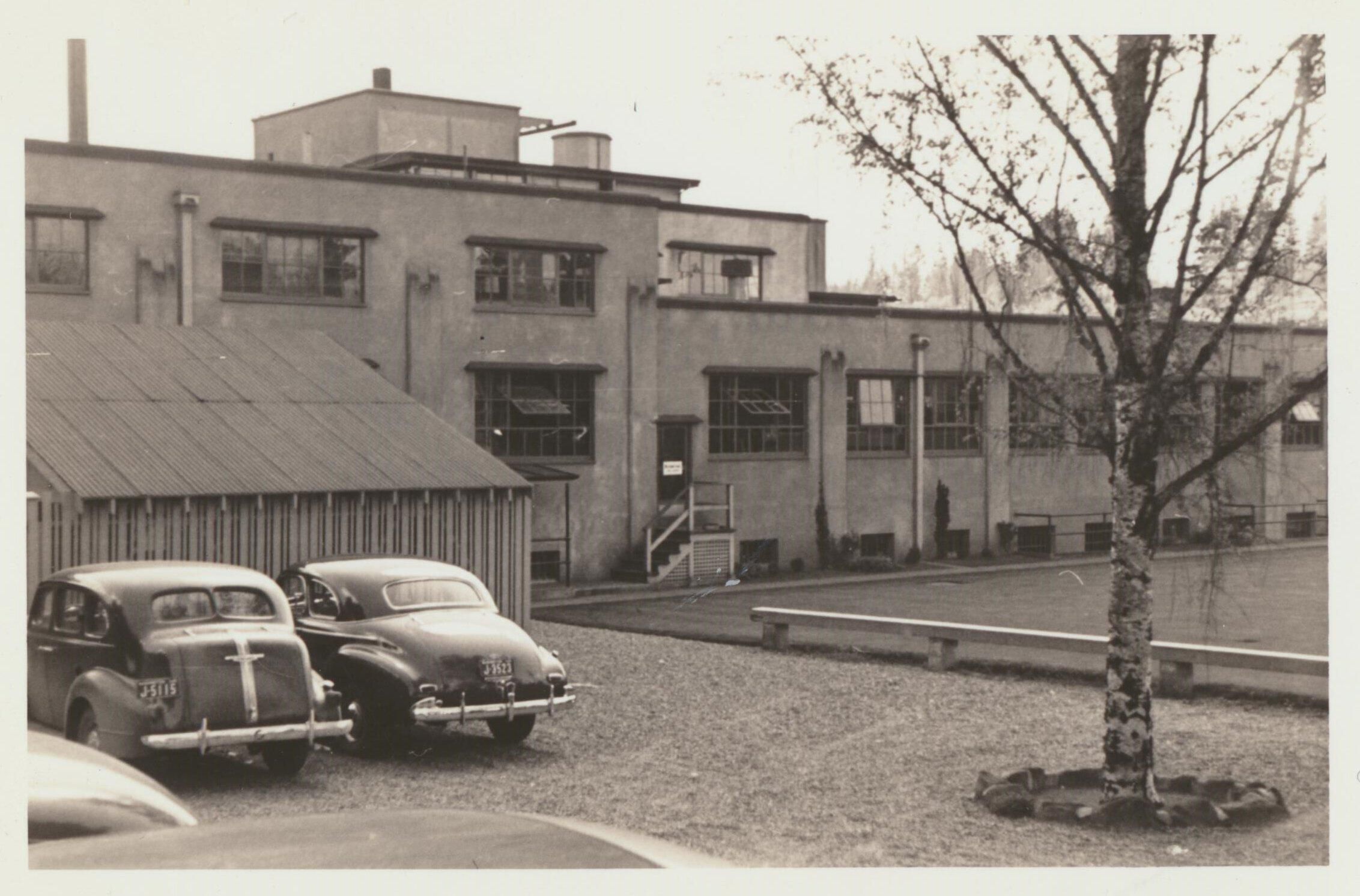 Photograph. Olympia brewery. A-bottle house, with J and K cellars on right in the background. Looking south from Custer Way.