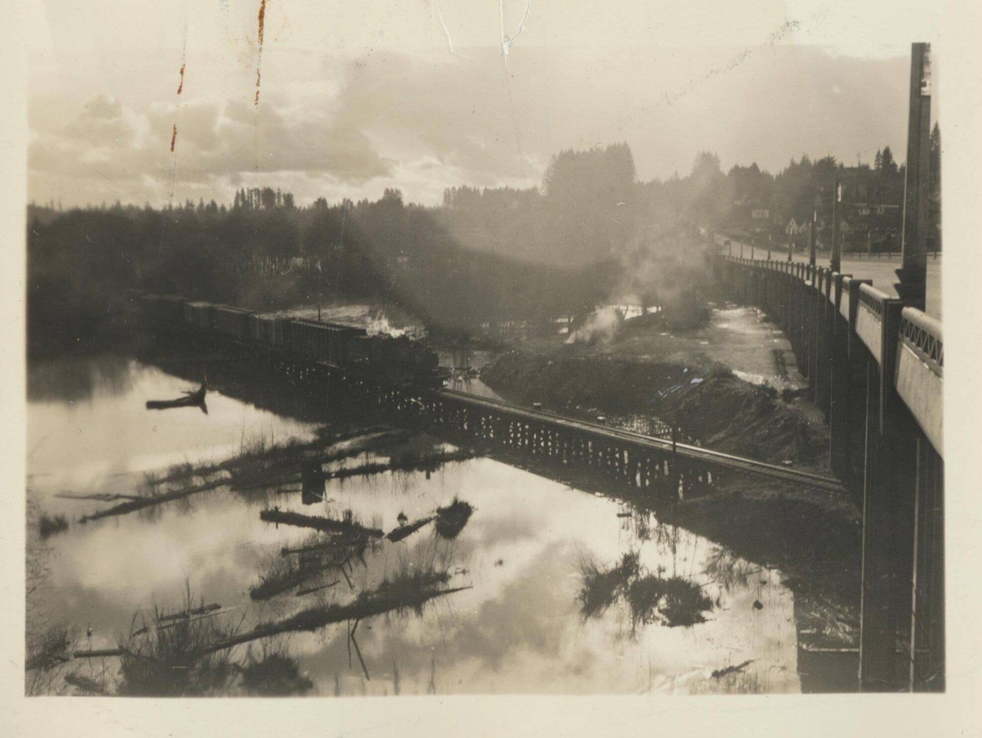 Photograph. High water on east side of Carlyon Bridge. This marsh would later be drained and filled for bottle shop/warehouse complex at brewery.
