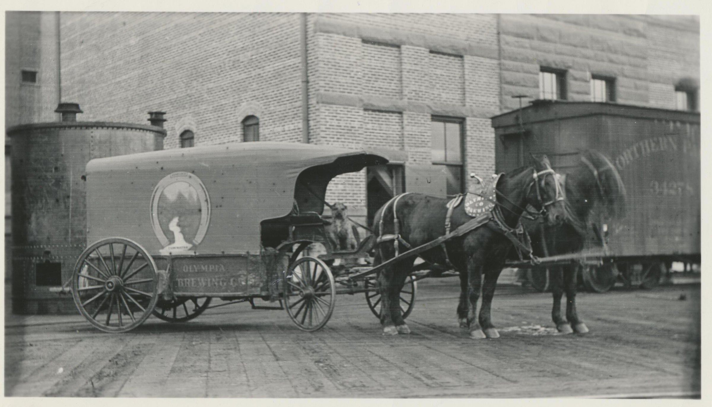 Photograph. Olympia Brewing wagon and horse team in front of brewhouse. Note dog in wagon, and Northern Pacific railcar at right. At far left is a large tank/boiler, probably part of the coal-to-gas equipment developed by Peter G. Schmidt Sr.Name/Title