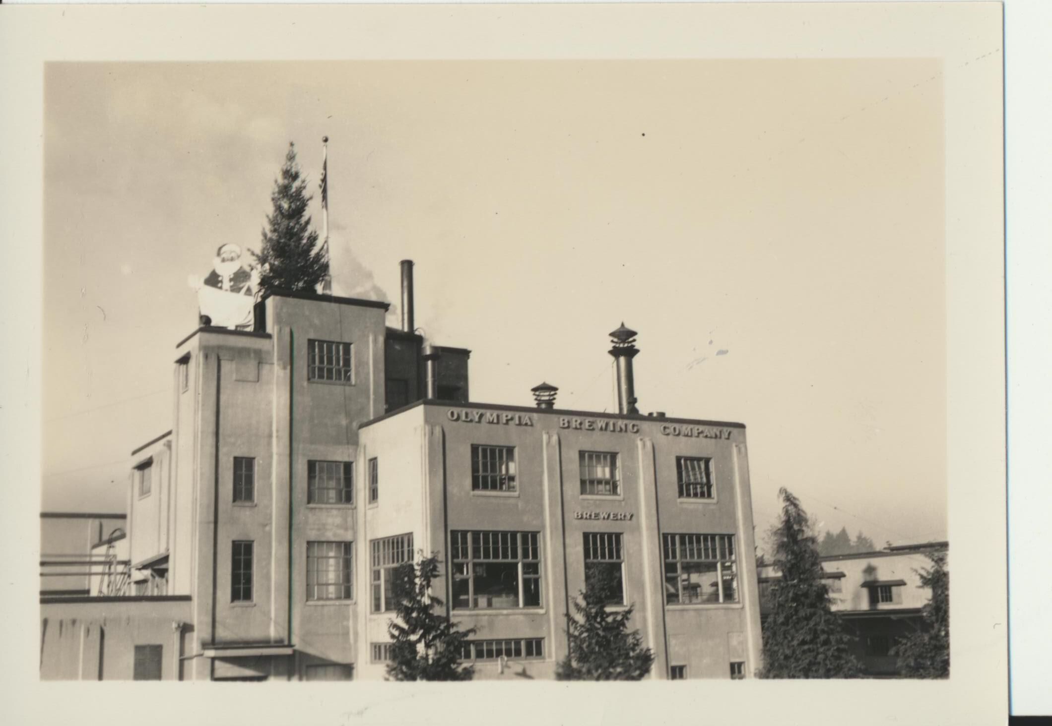 Photograph. East side of Olympia Brewing Co. with Santa Claus figure on roof.