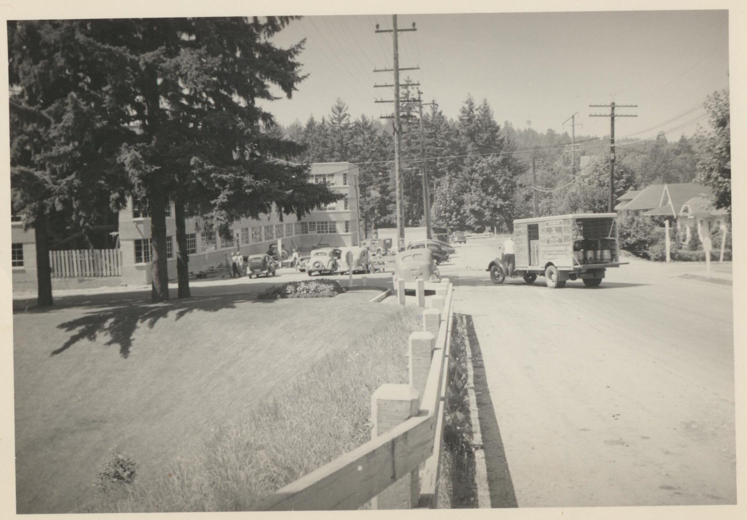Photograph. Olympia Brewery, looking west from Custer Way. Beer distributing truck on right.