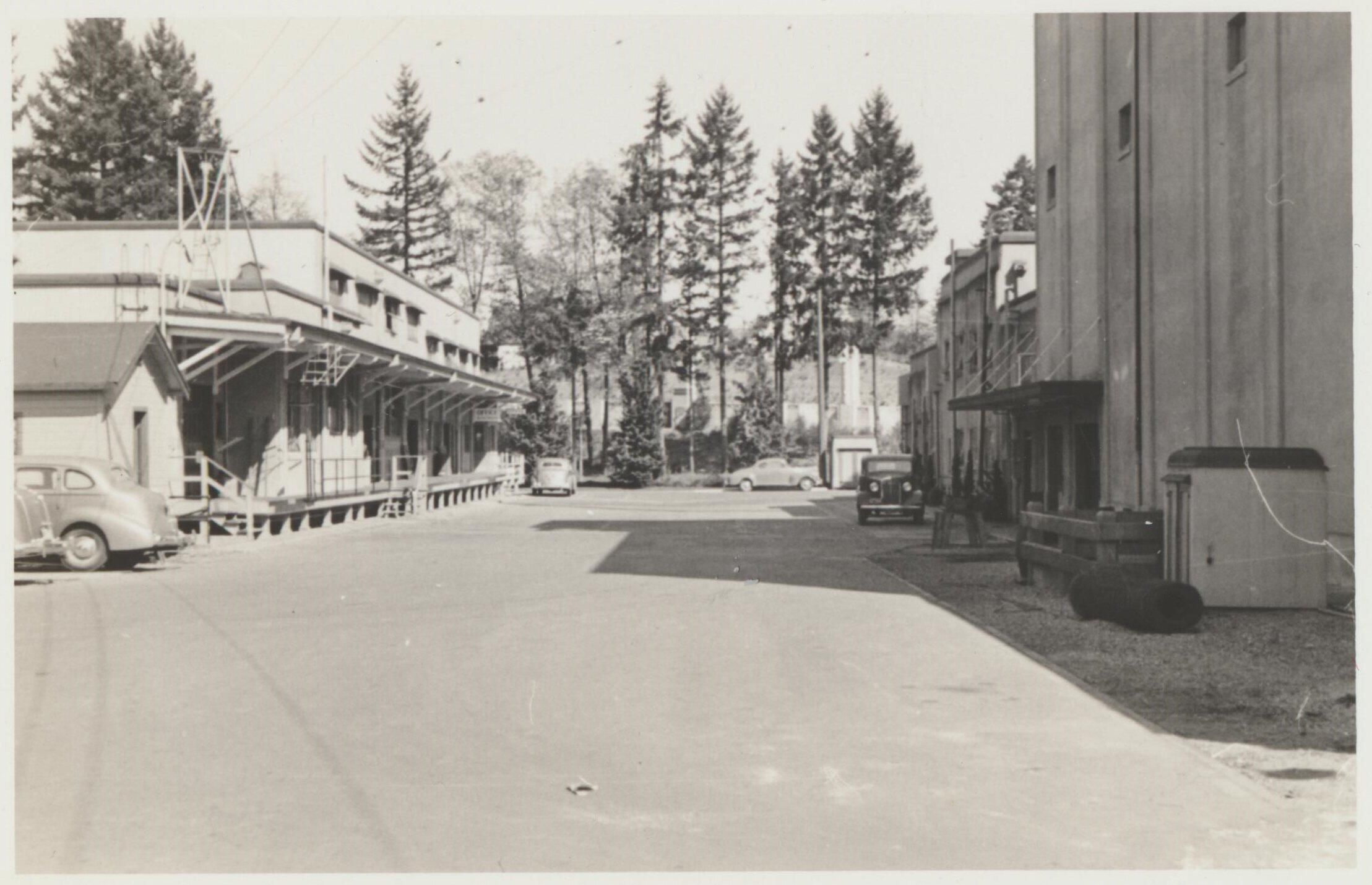 Photograph. Olympia Brewery. A-bottle house on left, A-B cellars on right.
