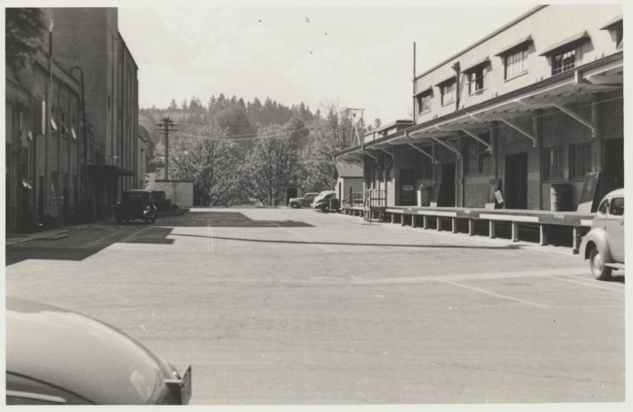 Photograph. Olympia Brewery. A-bottle house on right, A-B cellars on left.