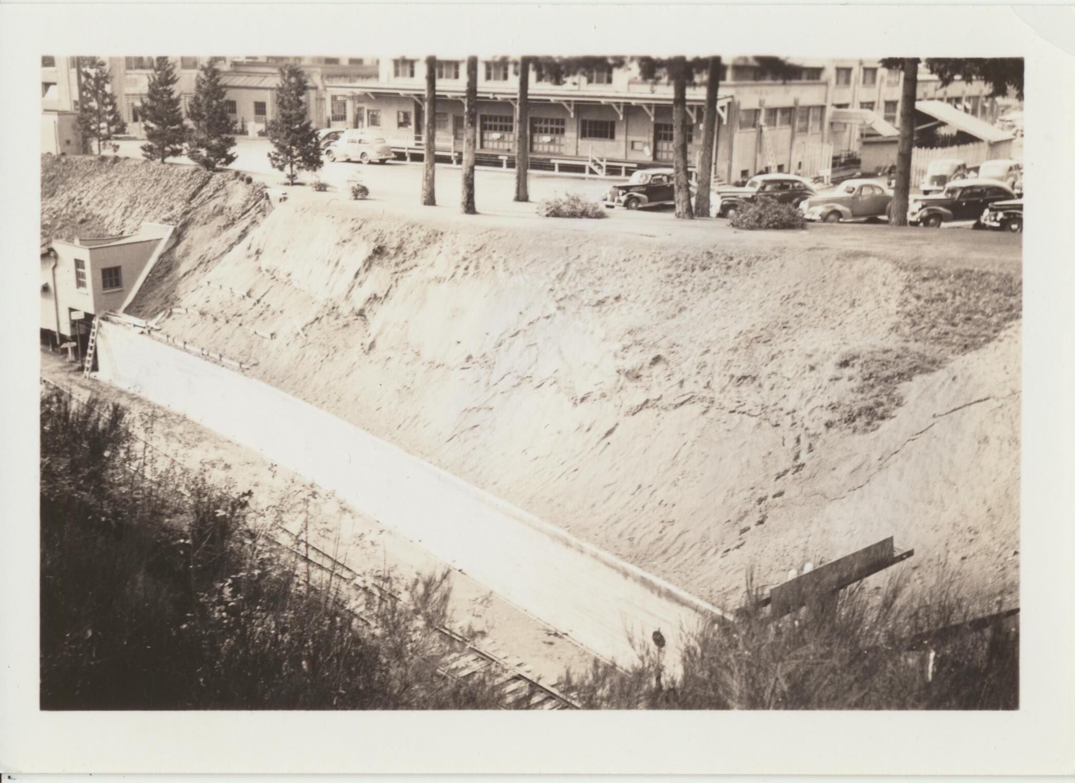 Photograph. Olympia Brewery. Cut bank on east side of plant, going down to railroad track.