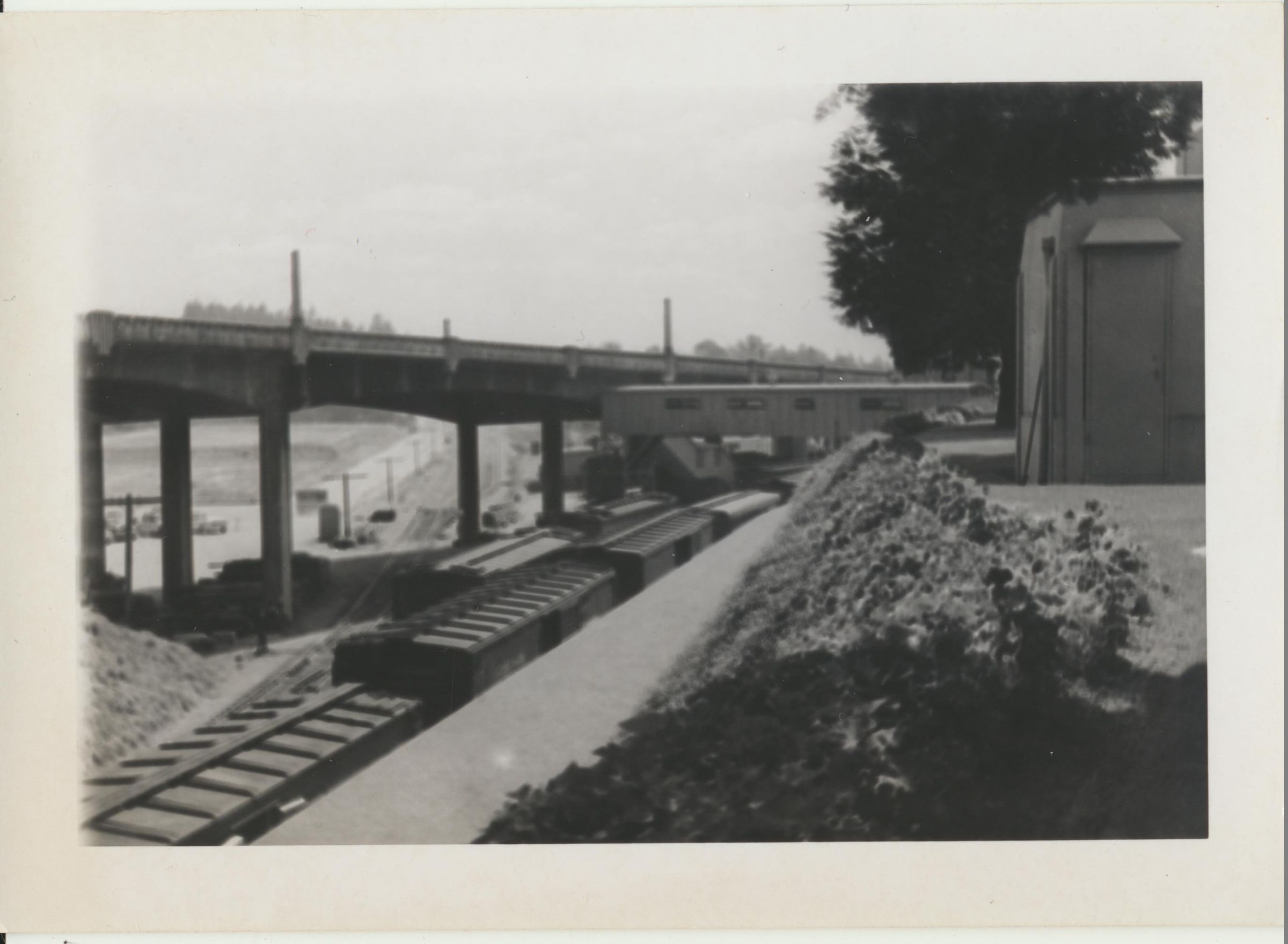 Photograph. Looking southeast from brewery, showing railroad cars and Carlyon Bridge. Marsh has already been filled in for bottlehouse/warehouse construction.
