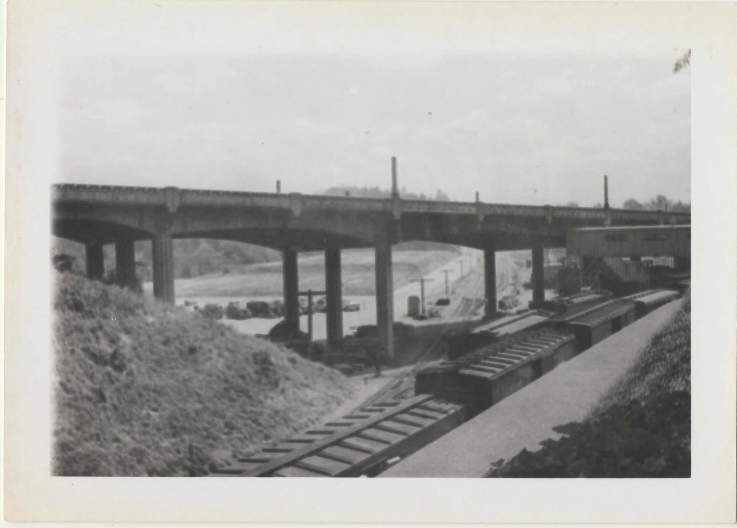 Photograph. Looking southeast from brewery, showing railroad cars and Carlyon Bridge. Marsh has already been filled in for bottlehouse/warehouse construction.
