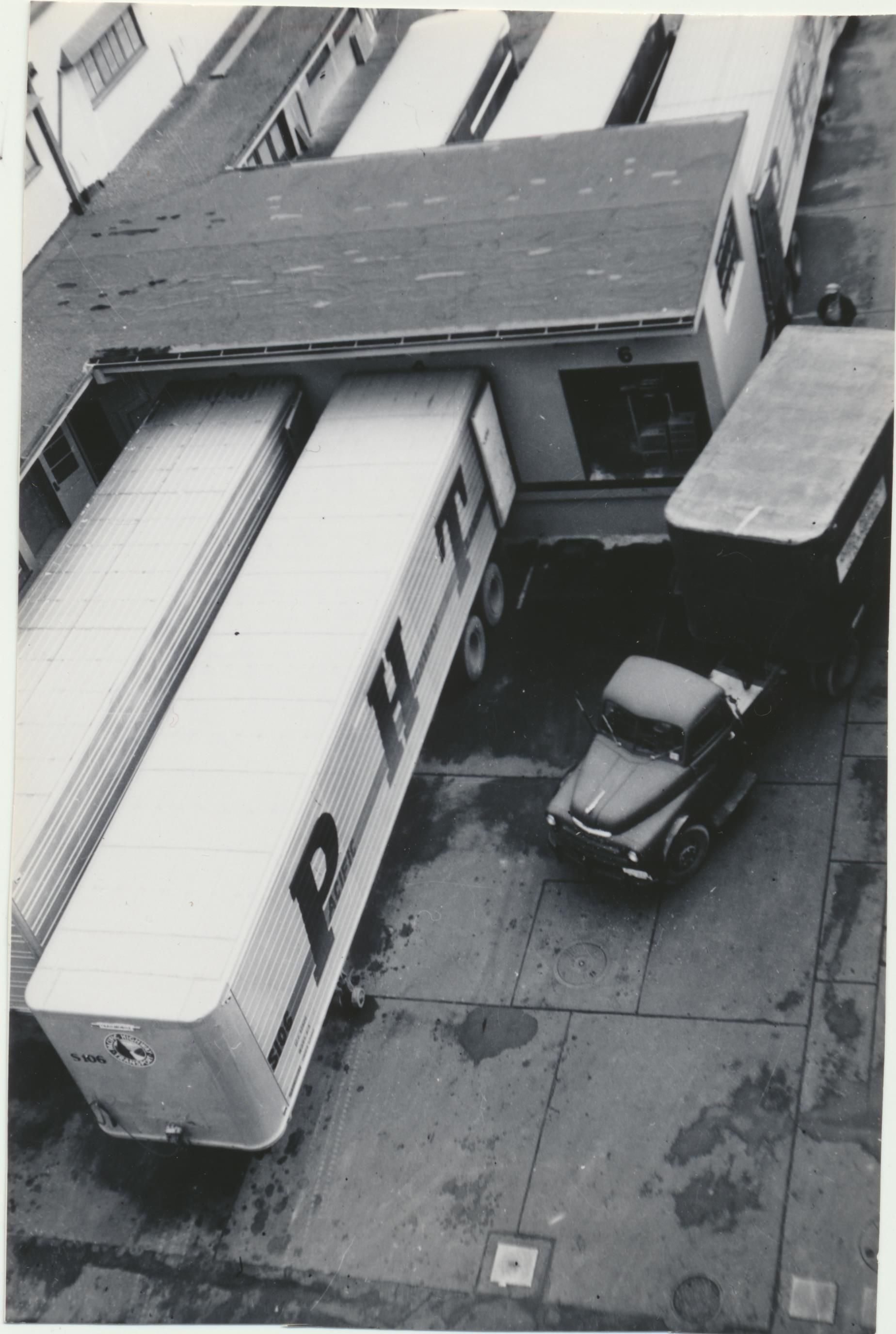 Photograph. Olympia brewery. A-bottle house loading area with Pacific Highway Transport trucks.