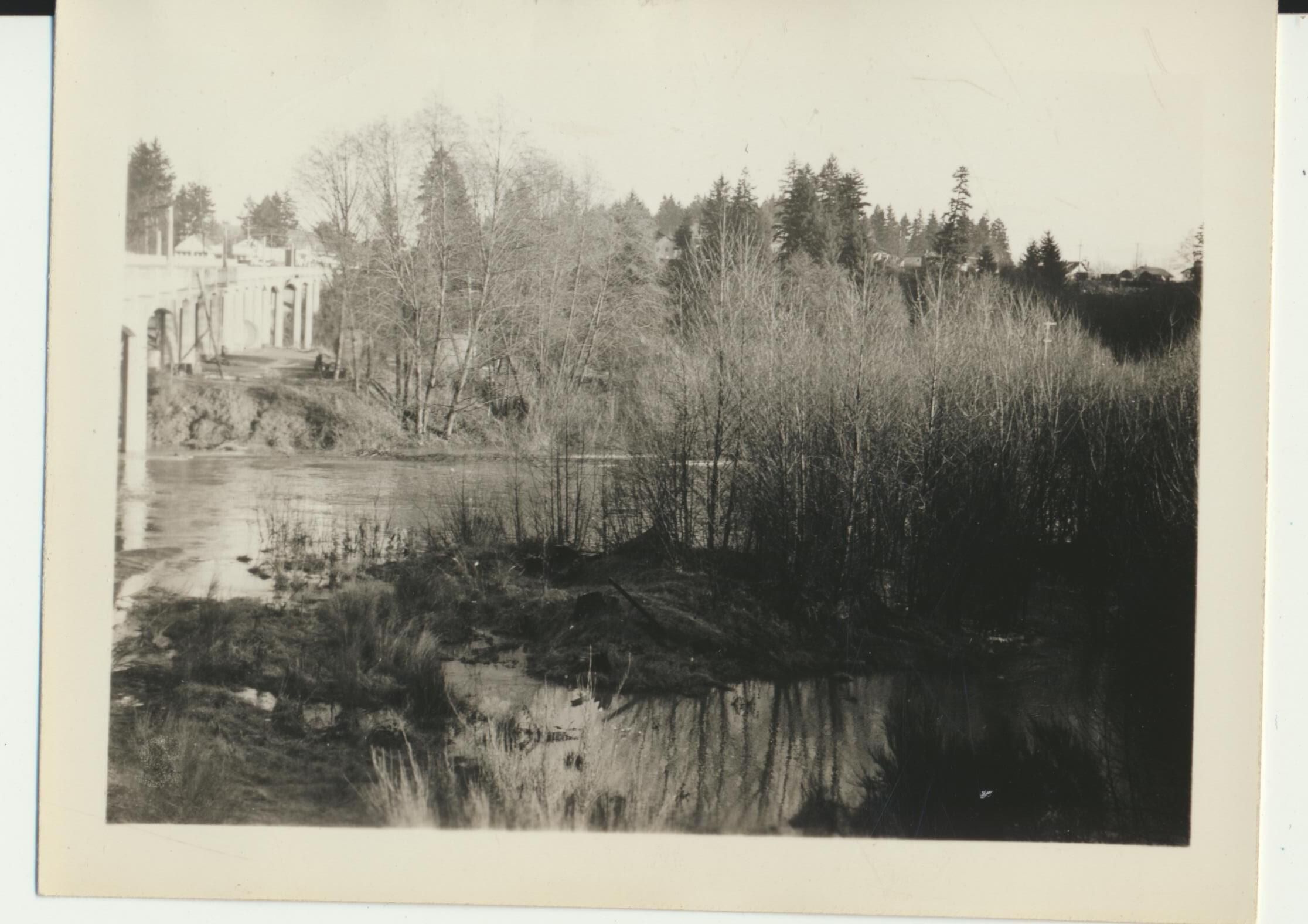 Photograph. Looking north over marsh on east side of Carlyon Bridge. Marsh will eventually be filled in for construction of bottlehouse/warehouse.