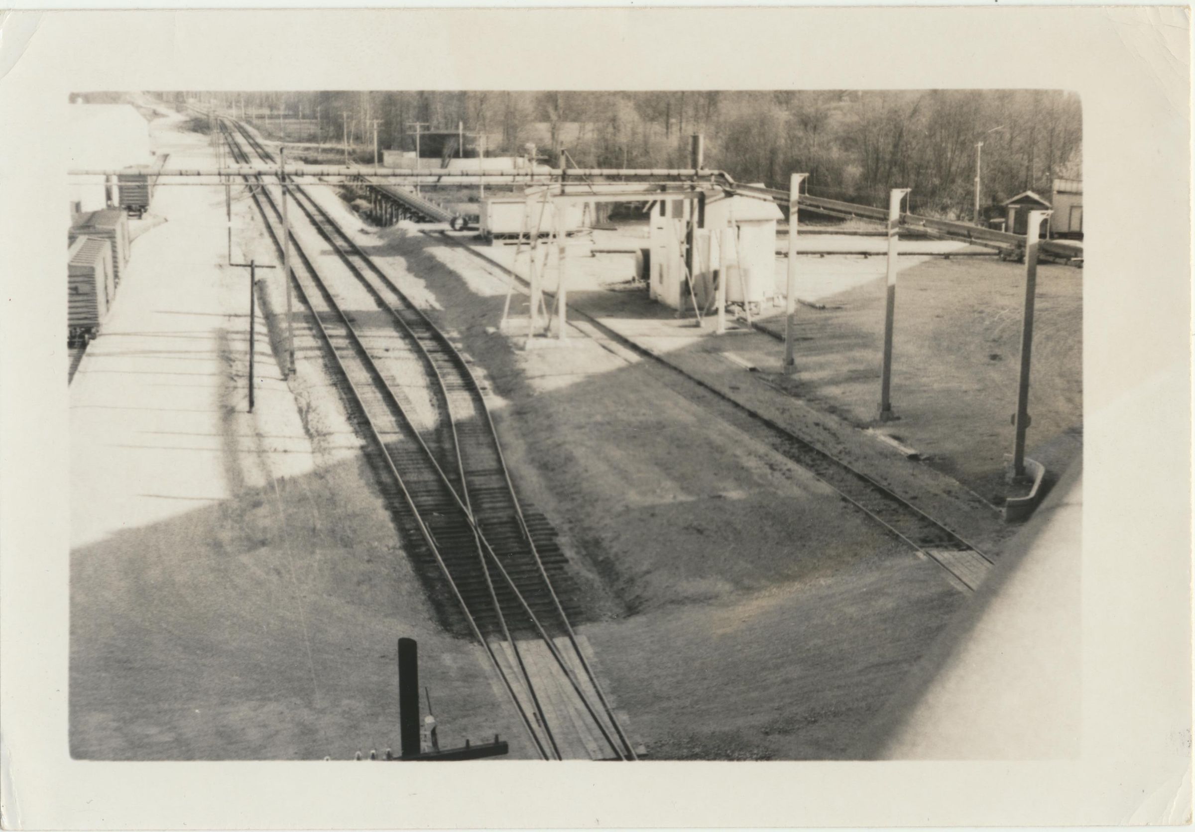 Photograph. Olympia brewery's warehouse area on east side of Carlyon Bridge. Pipeline trestle crosses the view in background.