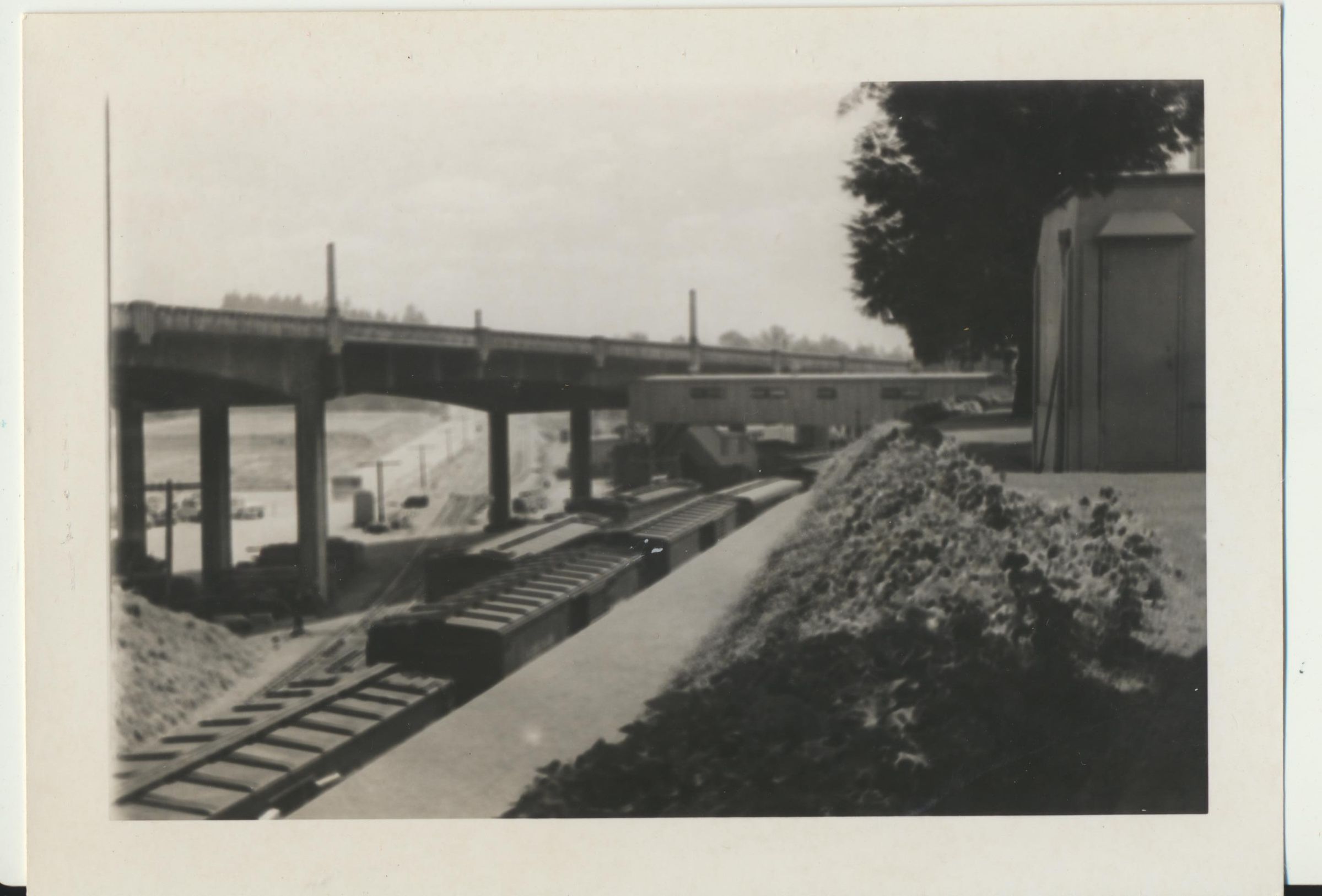 Photograph. Looking southeast from brewery, showing railroad cars and Carlyon Bridge. Marsh has already been filled in for bottlehouse/warehouse construction.