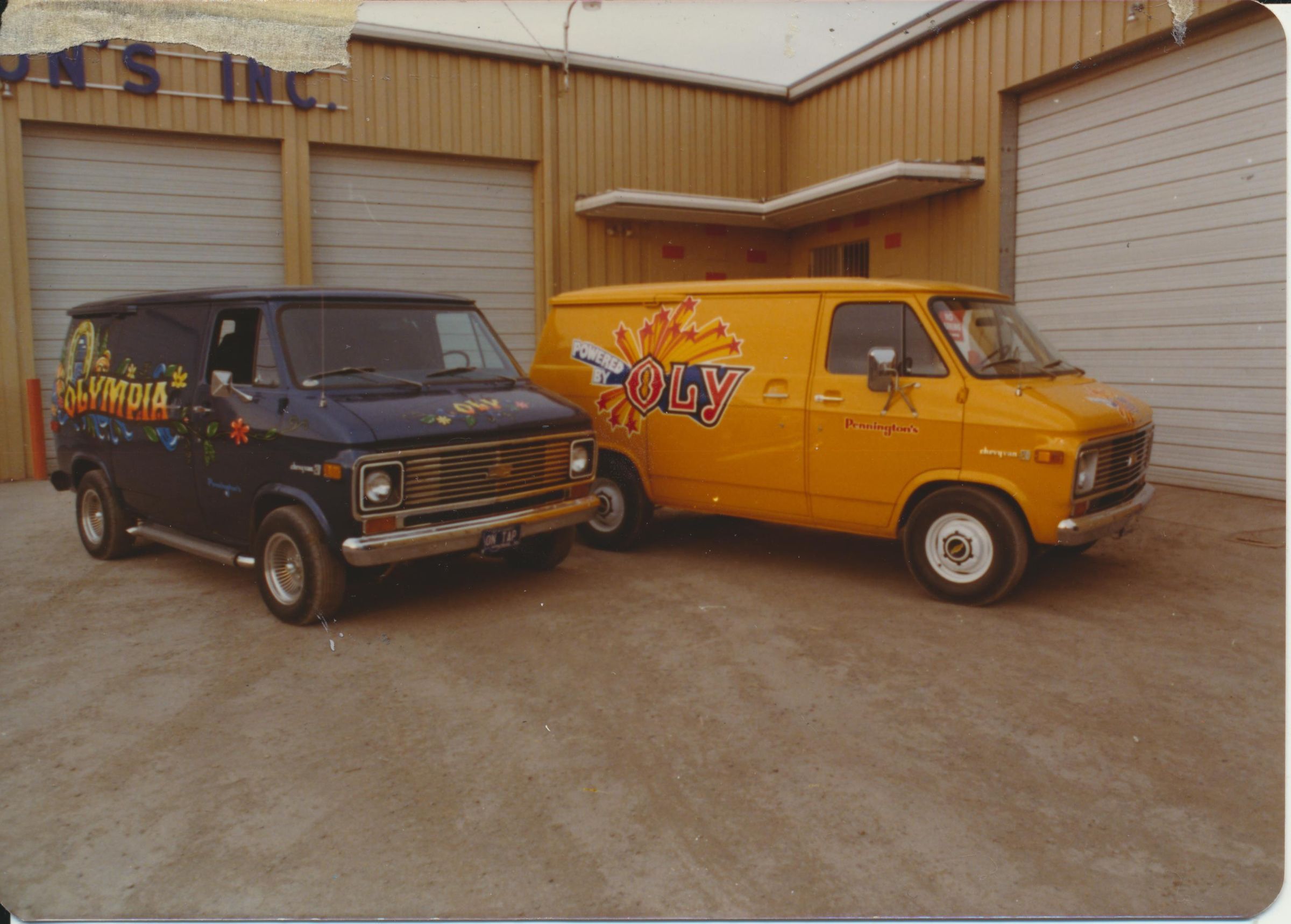 Photograph. Two vans painted with Olympia beer graphics. Pennington's Inc., a beverage distributor in Great Falls MT.