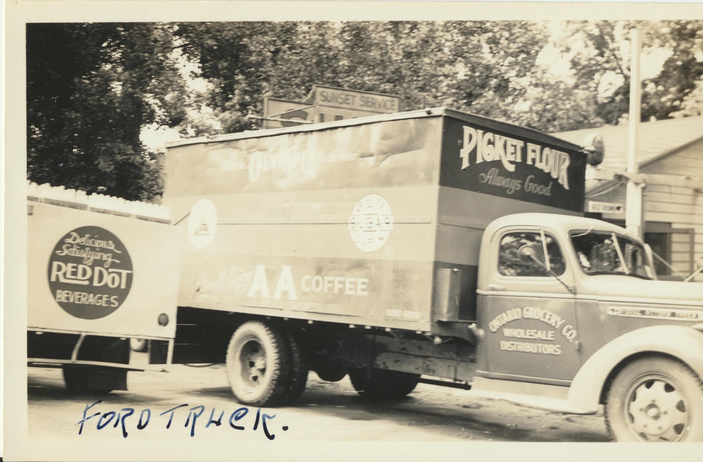 Photograph. Ford truck belonging to Ontario Grocery Co, distributor/wholesaler, from Ontario OR. Olympia beer logo on truck.