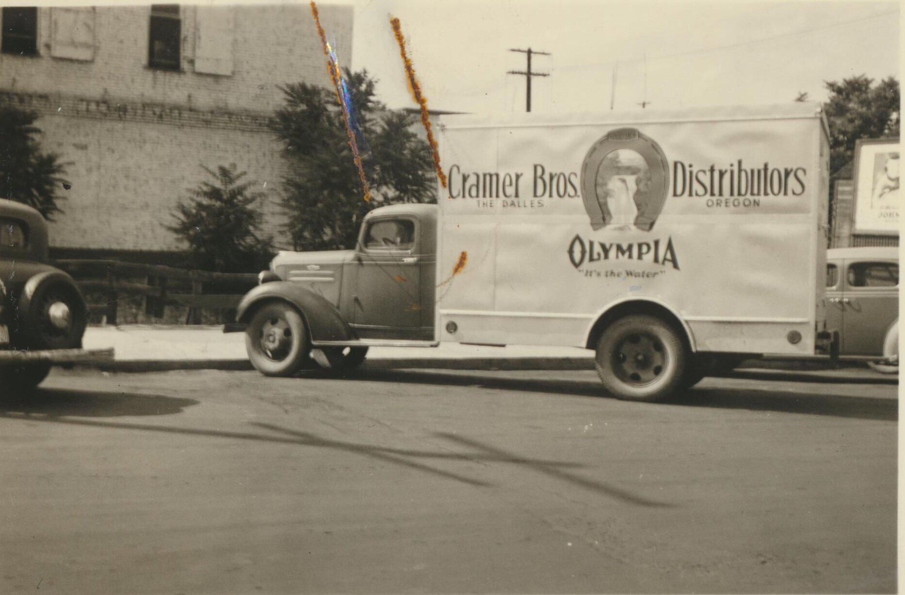 Photograph. Truck belonging to Cramer Brothers Distributors from The Dalles OR. Olympia beer logo on truck.