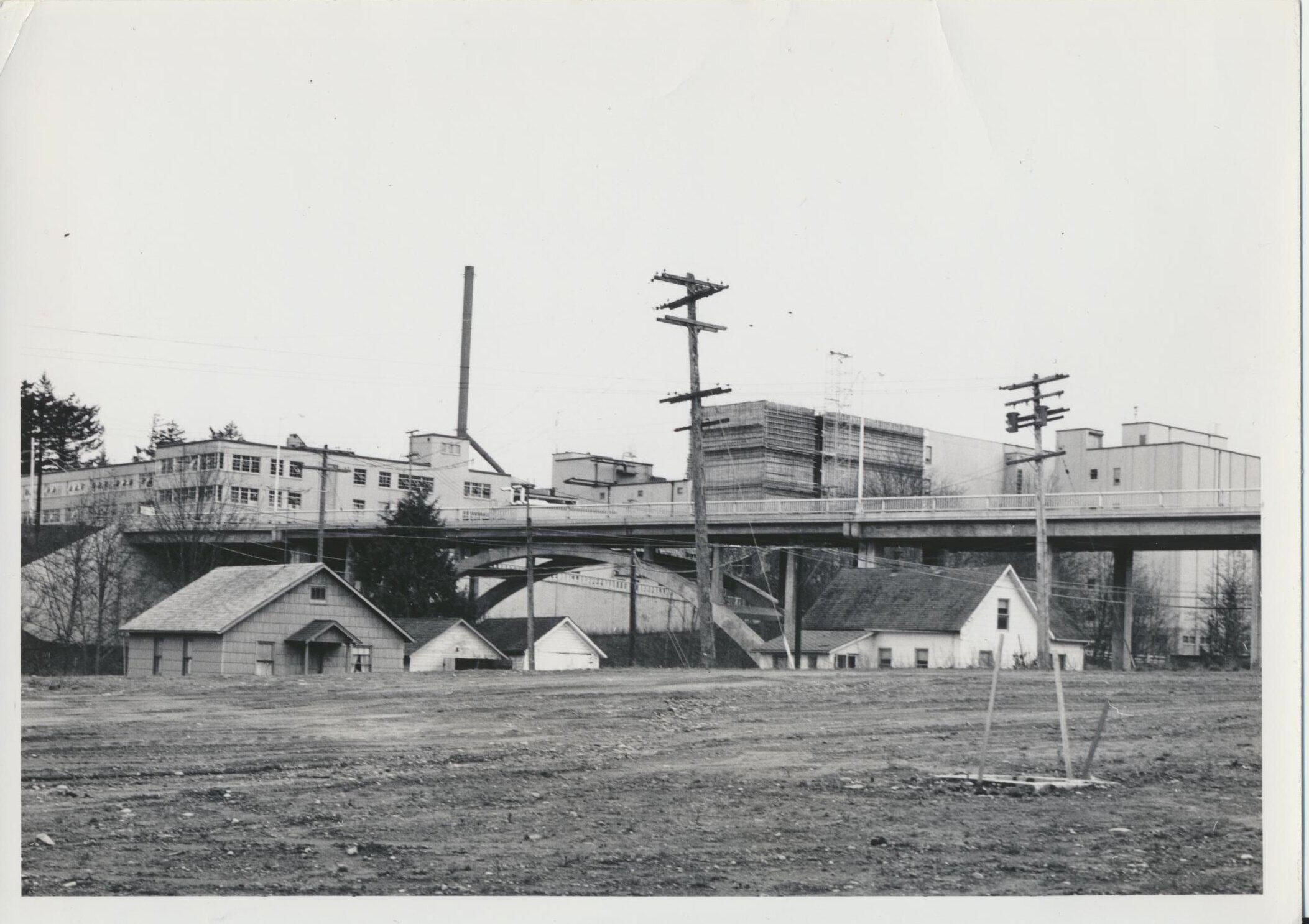Photograph. View of J cellar under construction (just right of center of photo). Custer Way Bridge in middle. Photographer standing on graded base for I-5, looking southeast. "Southbound lane - superhighway."Name/Title